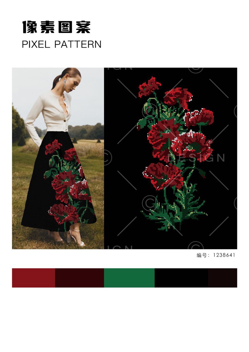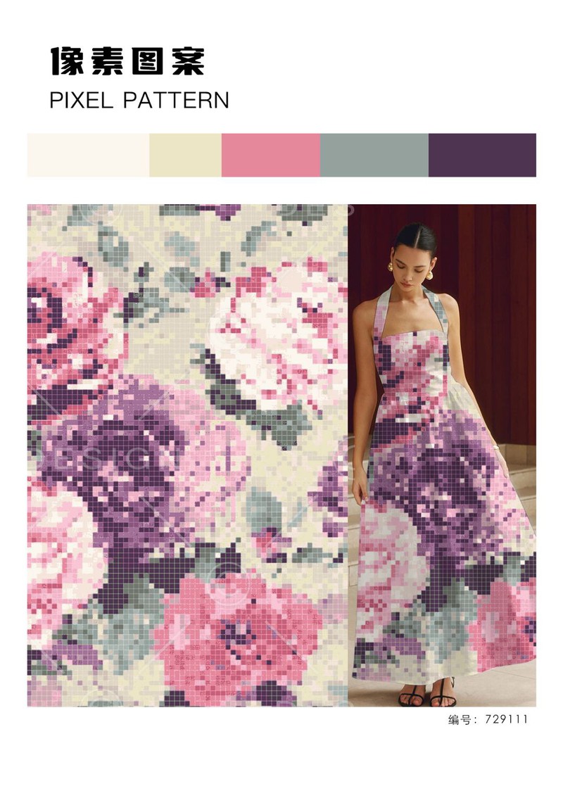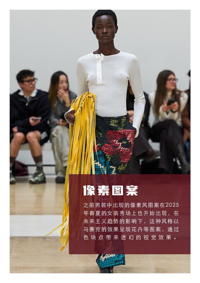 2025春夏女装印花&图案趋势:像素图案之前男装中出现的像素风图案在2025年春夏的女装秀场上也开始出现,在未来主义趋势的影响下,这种风格以马赛克的效果呈现花卉等图案,通过色块点带来迷幻的视觉效果~
