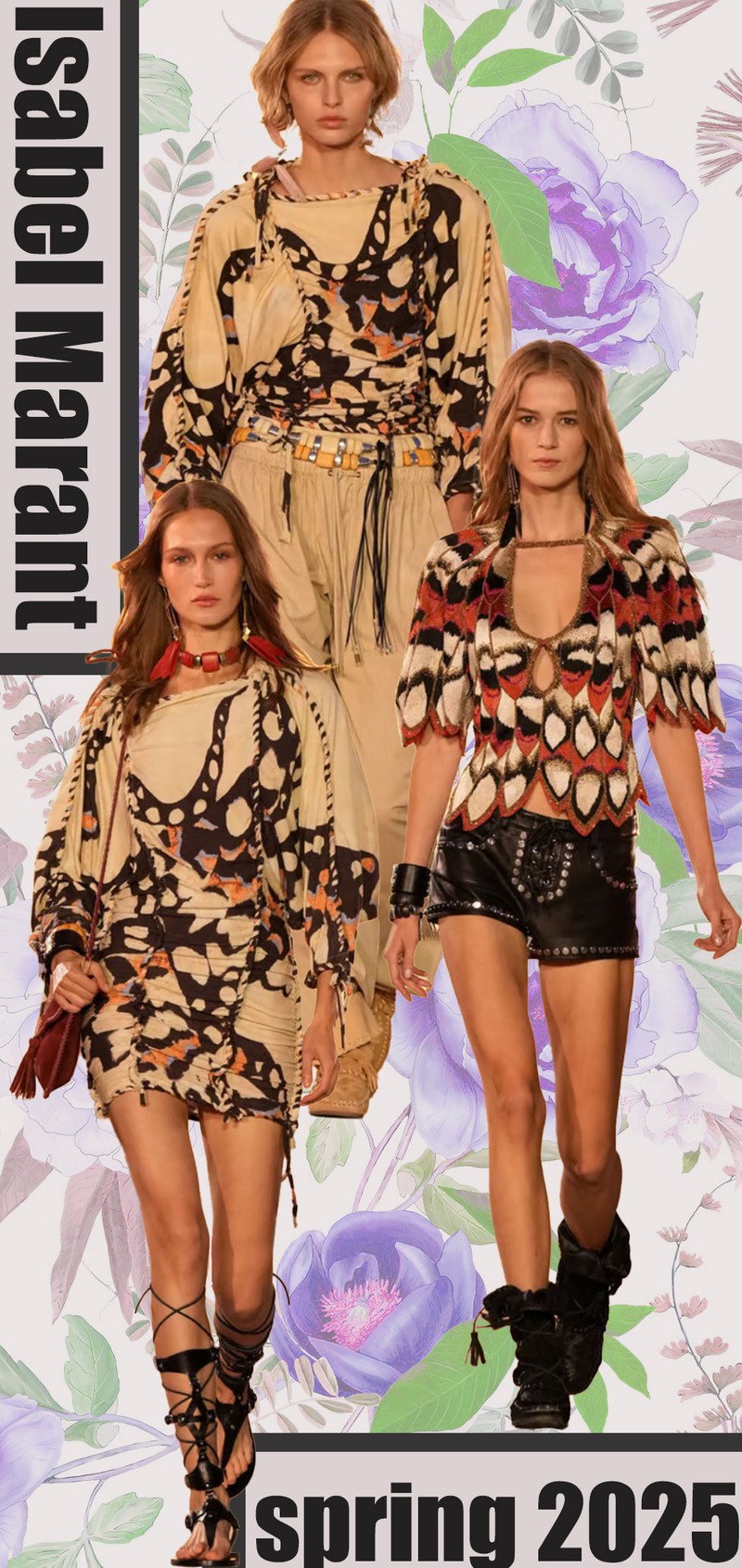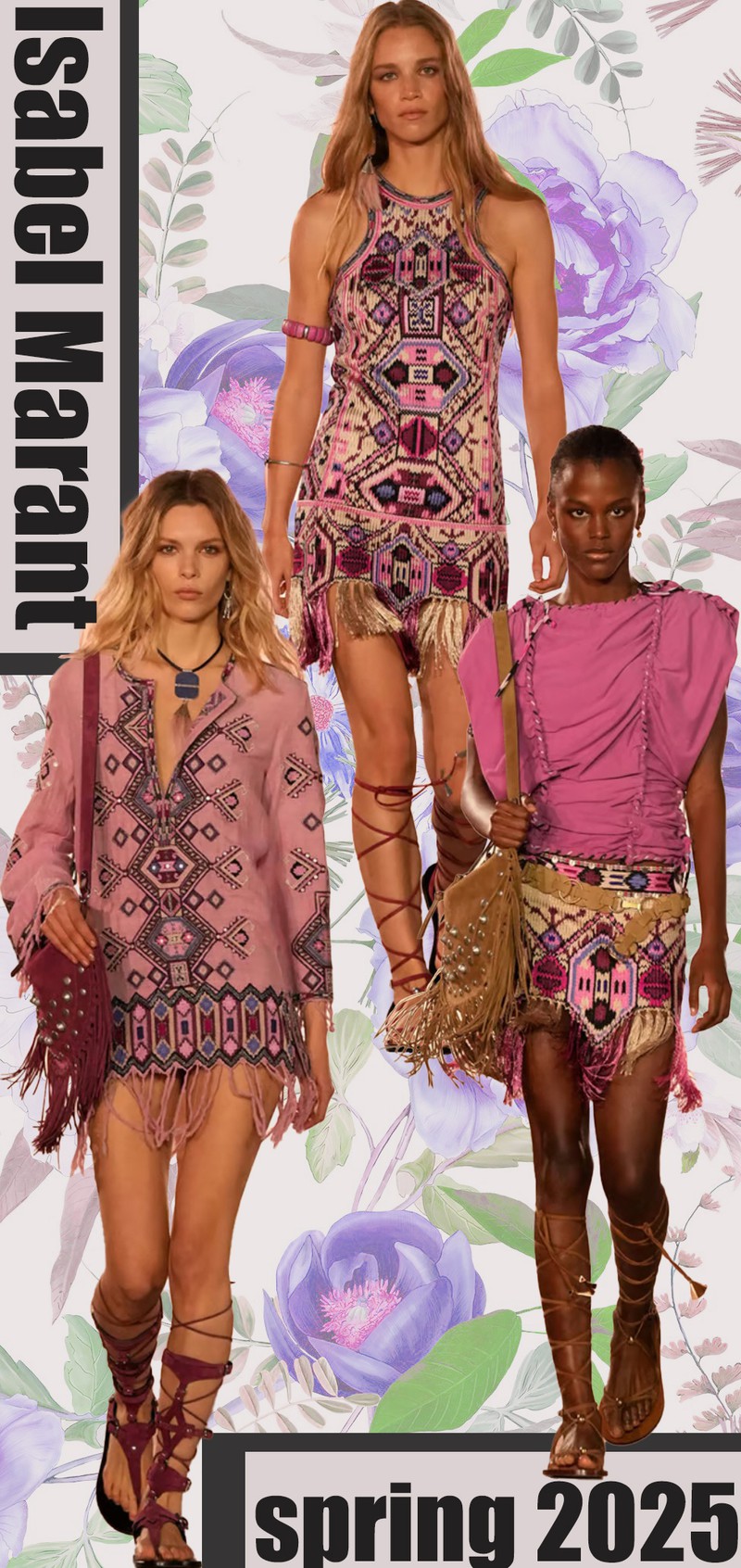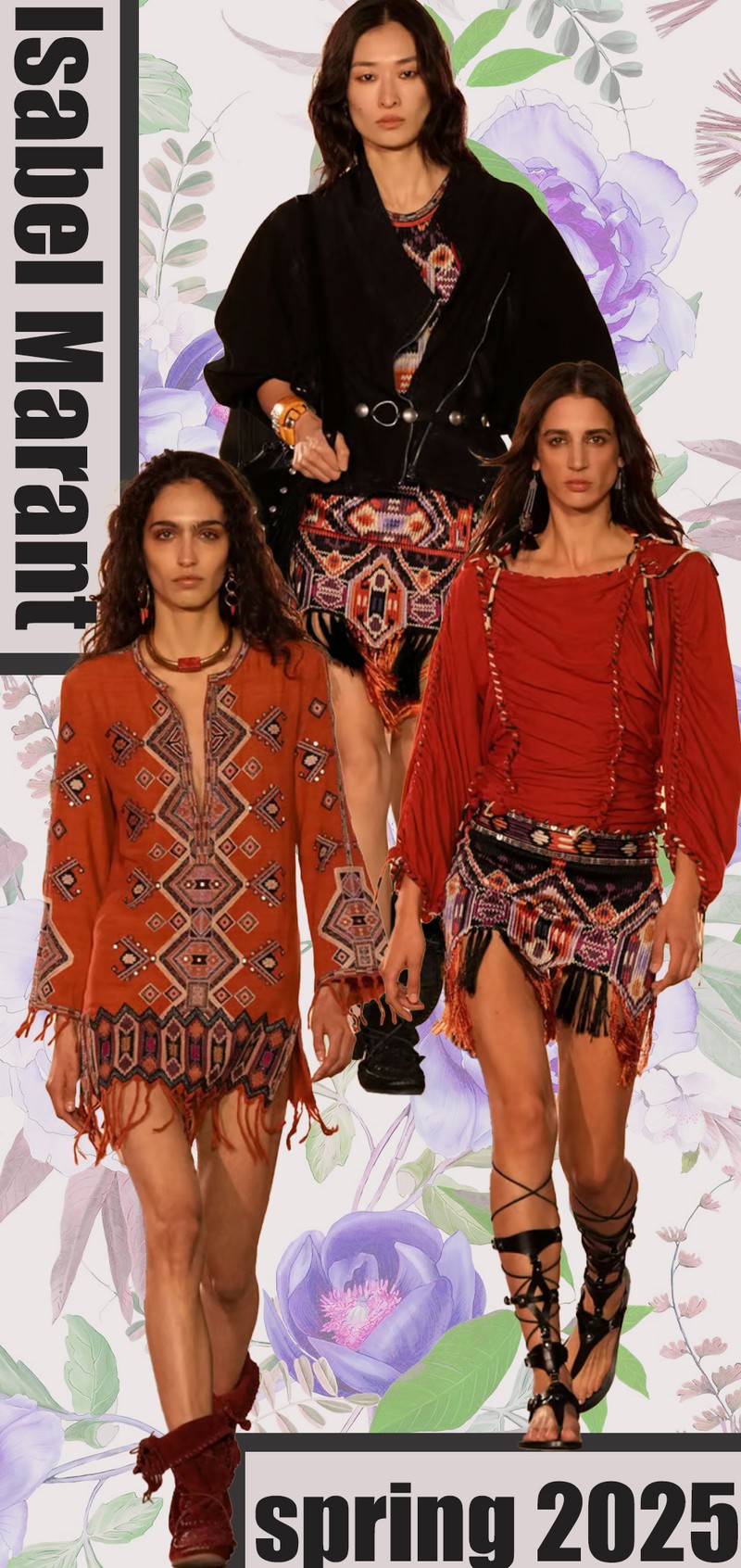 Isabel Marant spring 2025波西米亚风格的度假风套装上,传统的纹样的艺术感与复杂的肌理纹样让服装的层次感更加丰富,颜色搭配的系列感柔和,递进的相辅相成