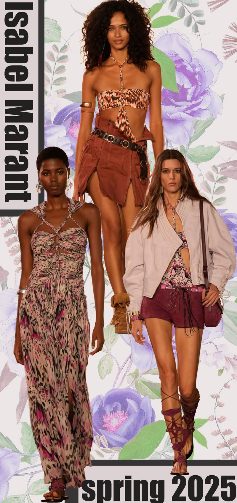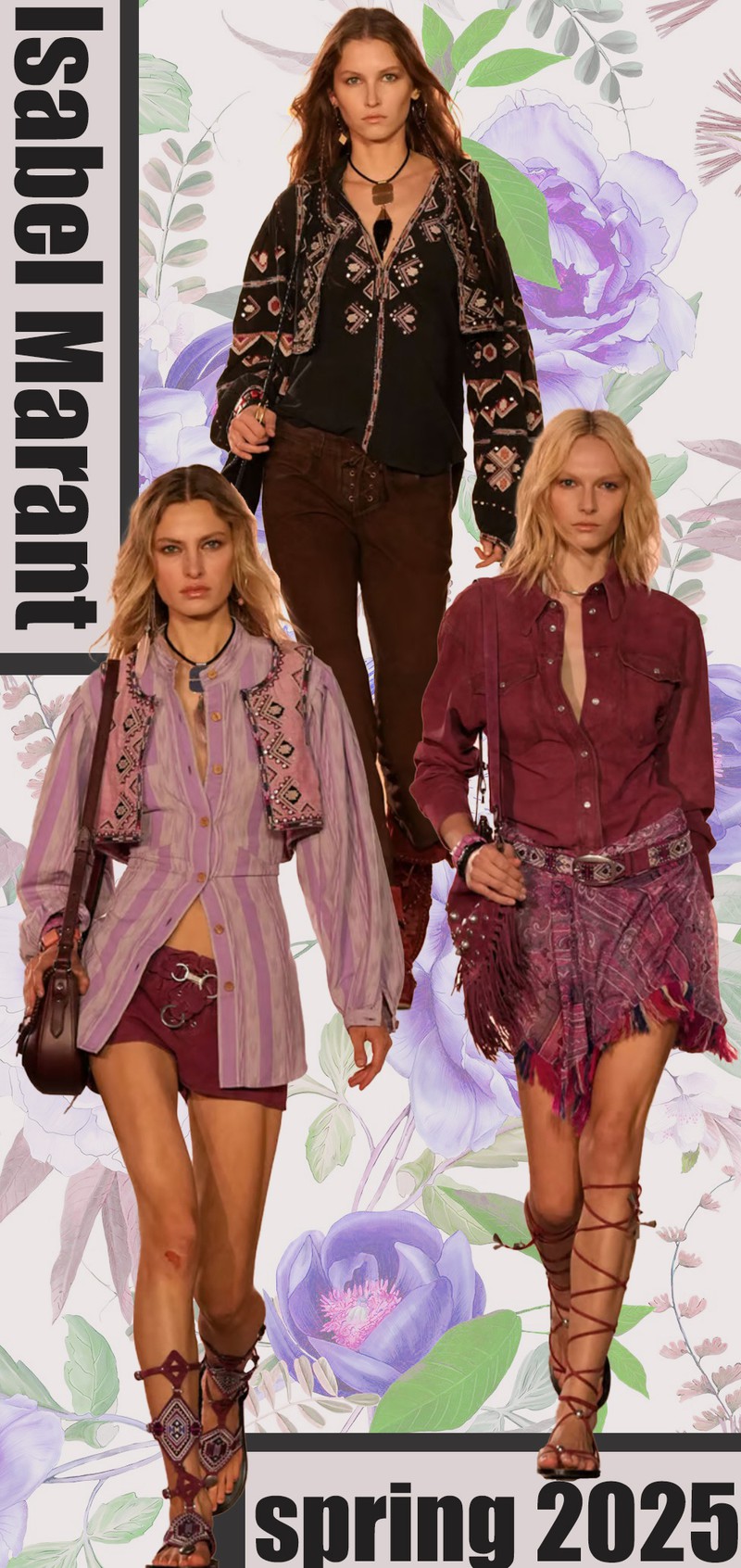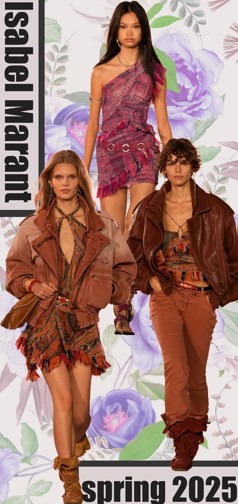 Isabel Marant spring 2025波西米亚风格的度假风套装上,传统的纹样的艺术感与复杂的肌理纹样让服装的层次感更加丰富,颜色搭配的系列感柔和,递进的相辅相成