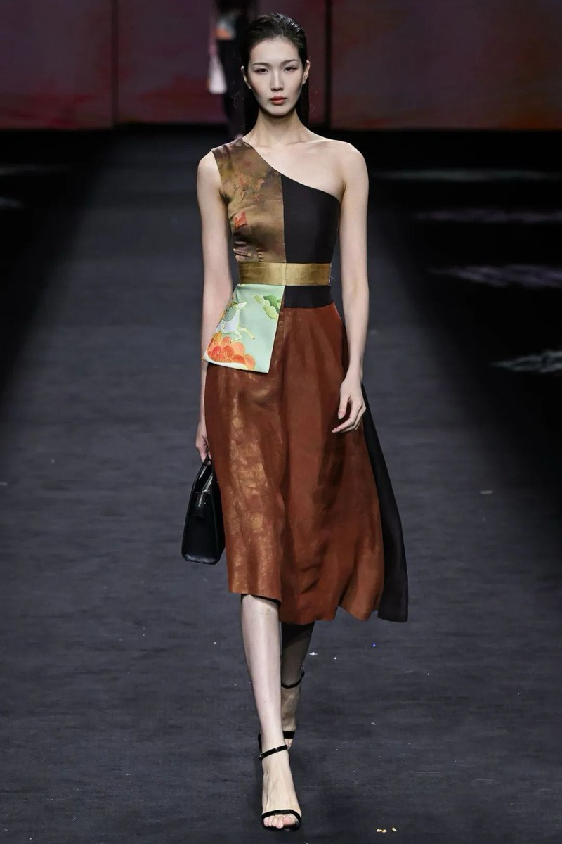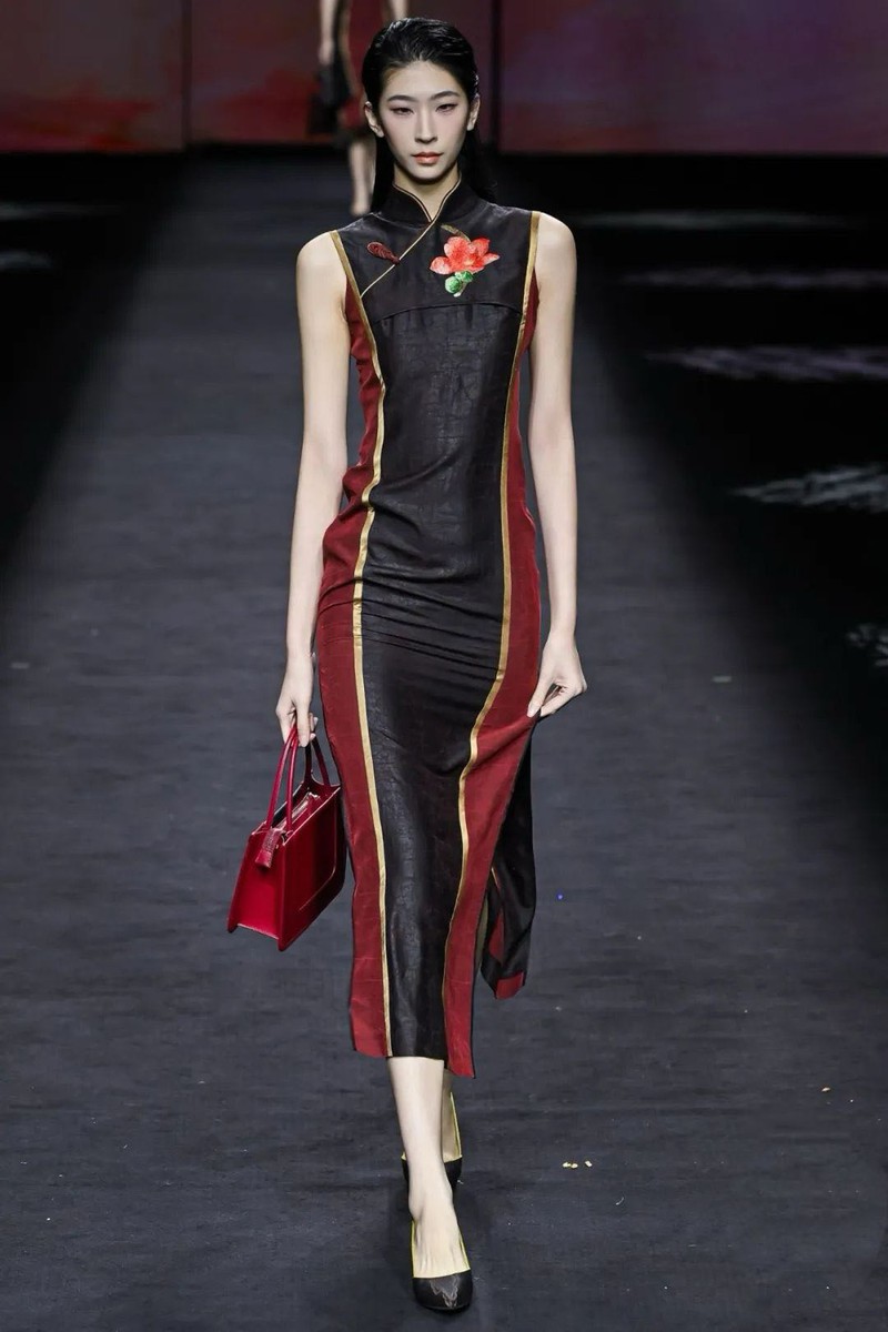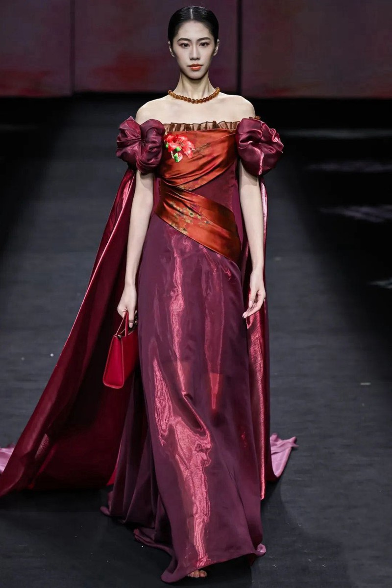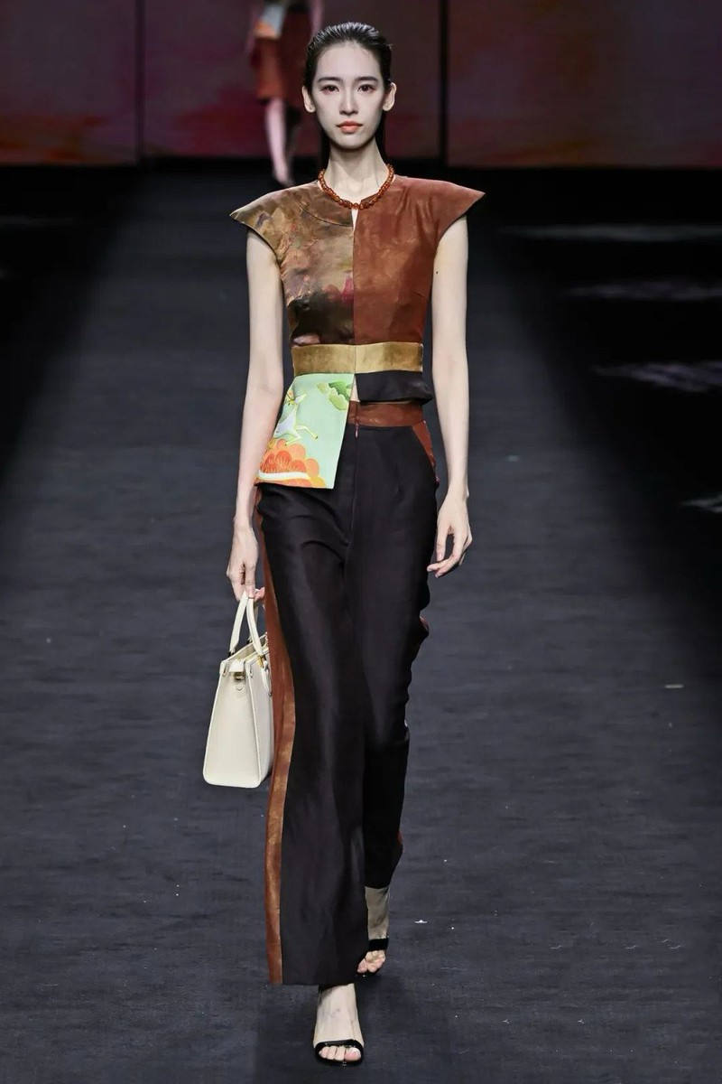 作品系列,香云纱的天然色泽与壮锦图案华丽映衬,既具传统韵味又不失现代感;台湾太鲁阁织锦的独特色彩与香云纱的深沉底蕴相互呼应,打造出具有浓郁台湾风情的服饰系列;东乡绣娘的精湛绣艺结合敦煌研究院授权九色鹿图腾,展现出香云纱细腻而独特的艺术魅力;而广绣的红橘相间与香云纱的沉稳古朴相映成趣,色彩的对比与融合,展现独特的艺术美感。