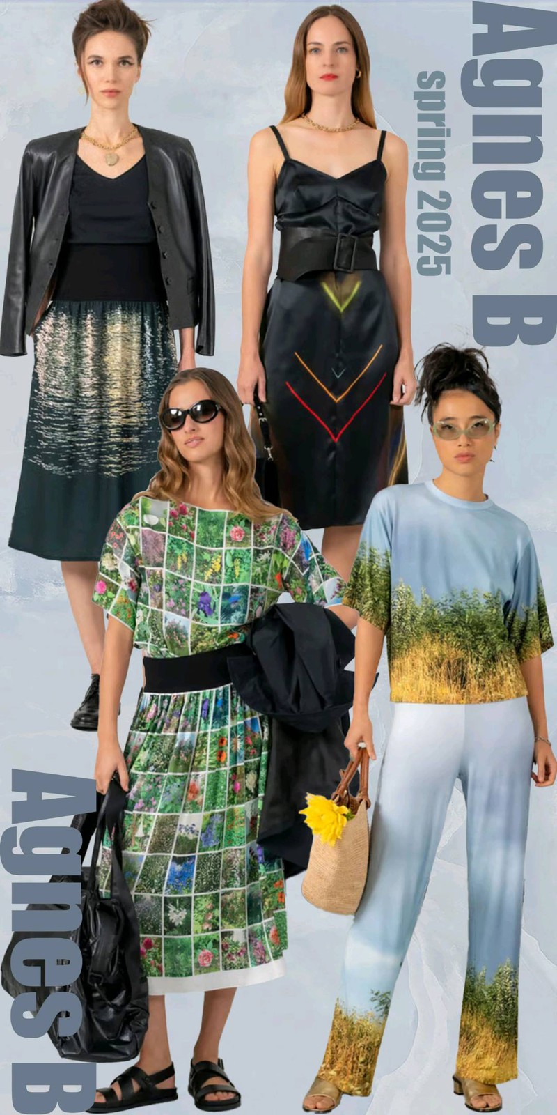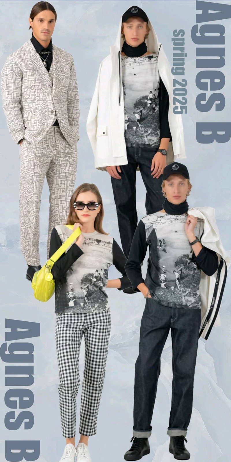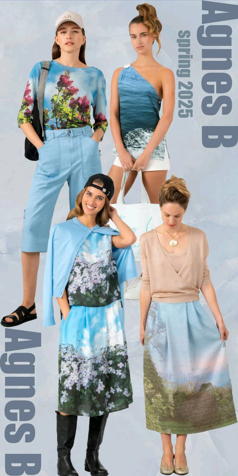 Agnes B spring 2025蓝调的海洋系列,波光粼粼的海面与几何度假风满满,绿色调的森林与植物拼接,灰色的几何图案与白色的线条,灰调的人物劳作照片多种系列有趣