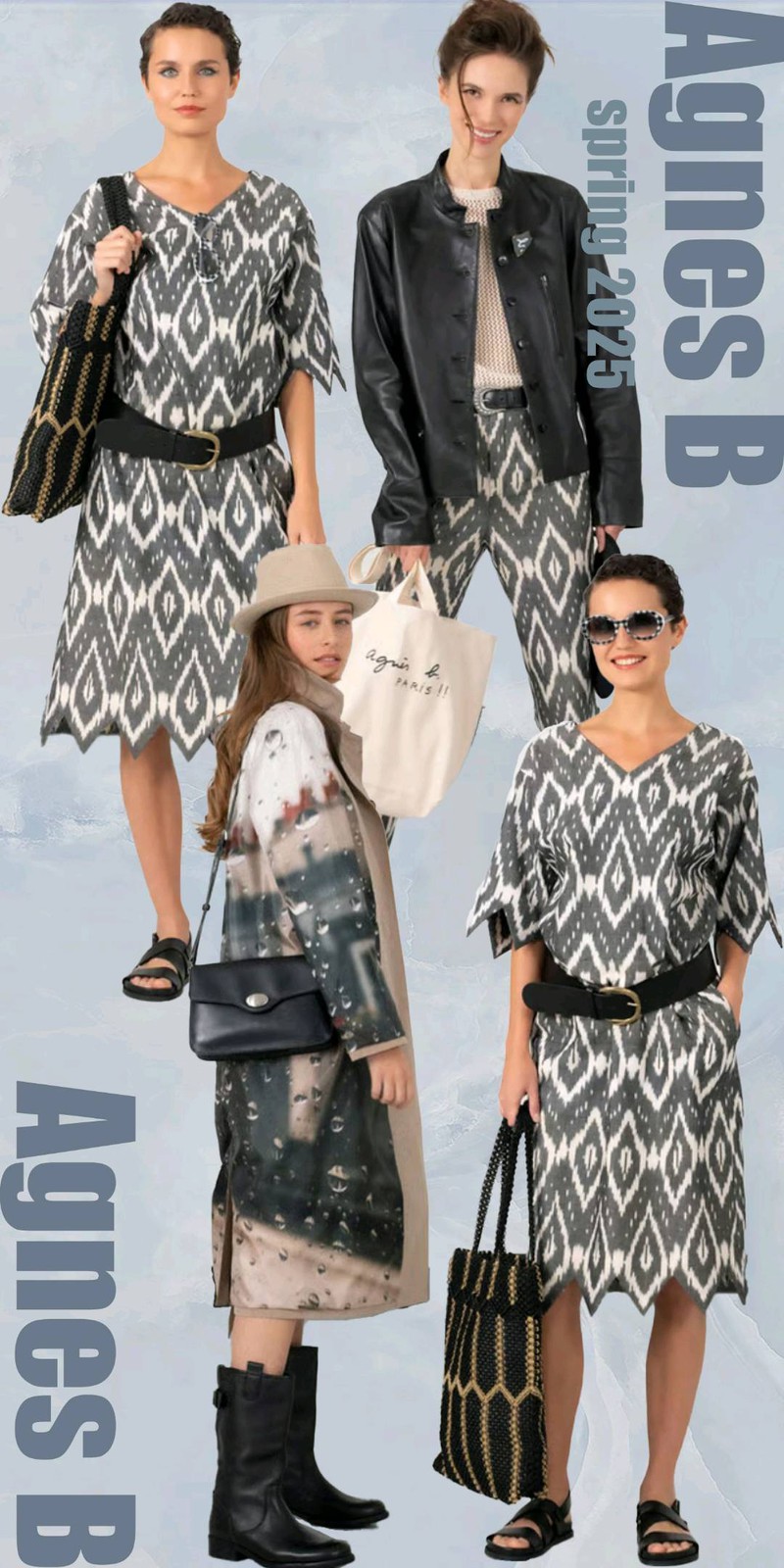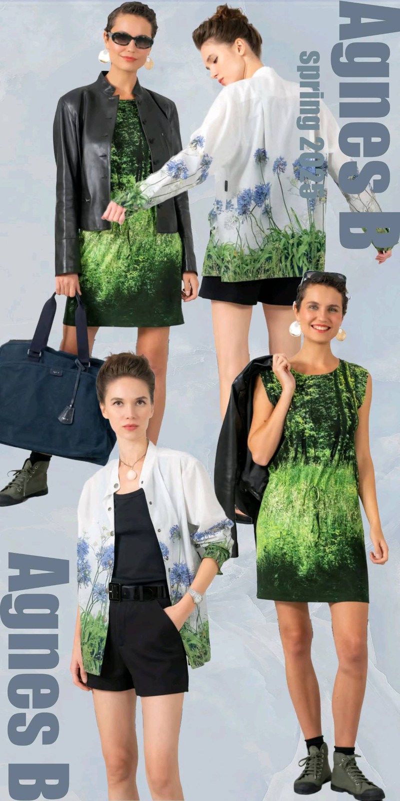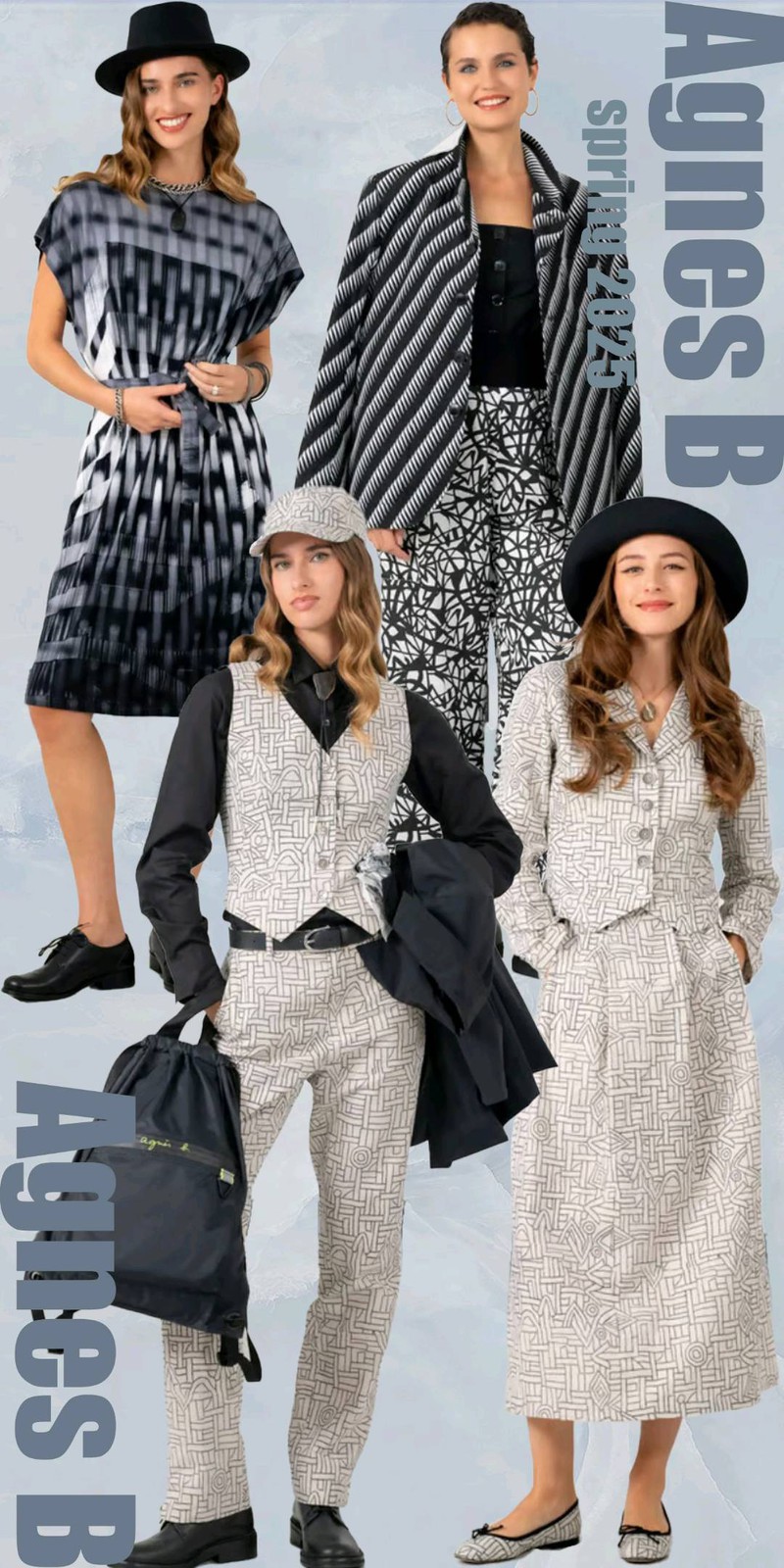 Agnes B spring 2025蓝调的海洋系列,波光粼粼的海面与几何度假风满满,绿色调的森林与植物拼接,灰色的几何图案与白色的线条,灰调的人物劳作照片多种系列有趣