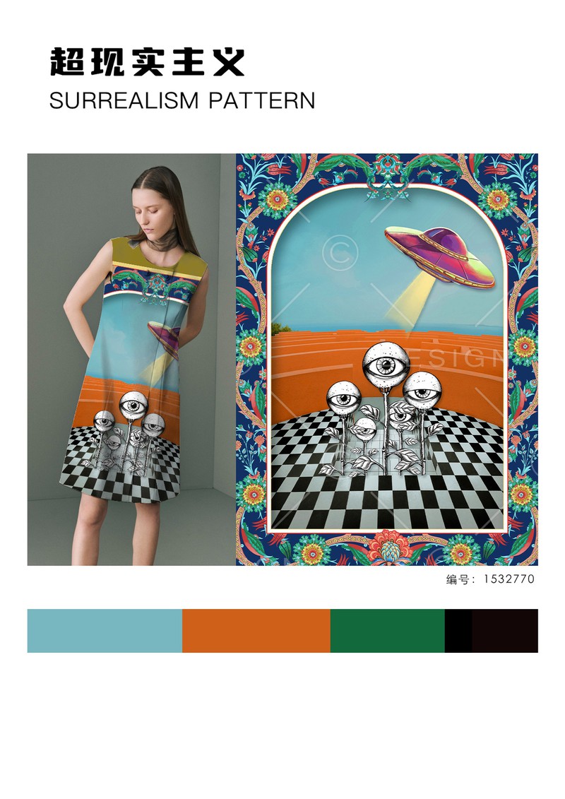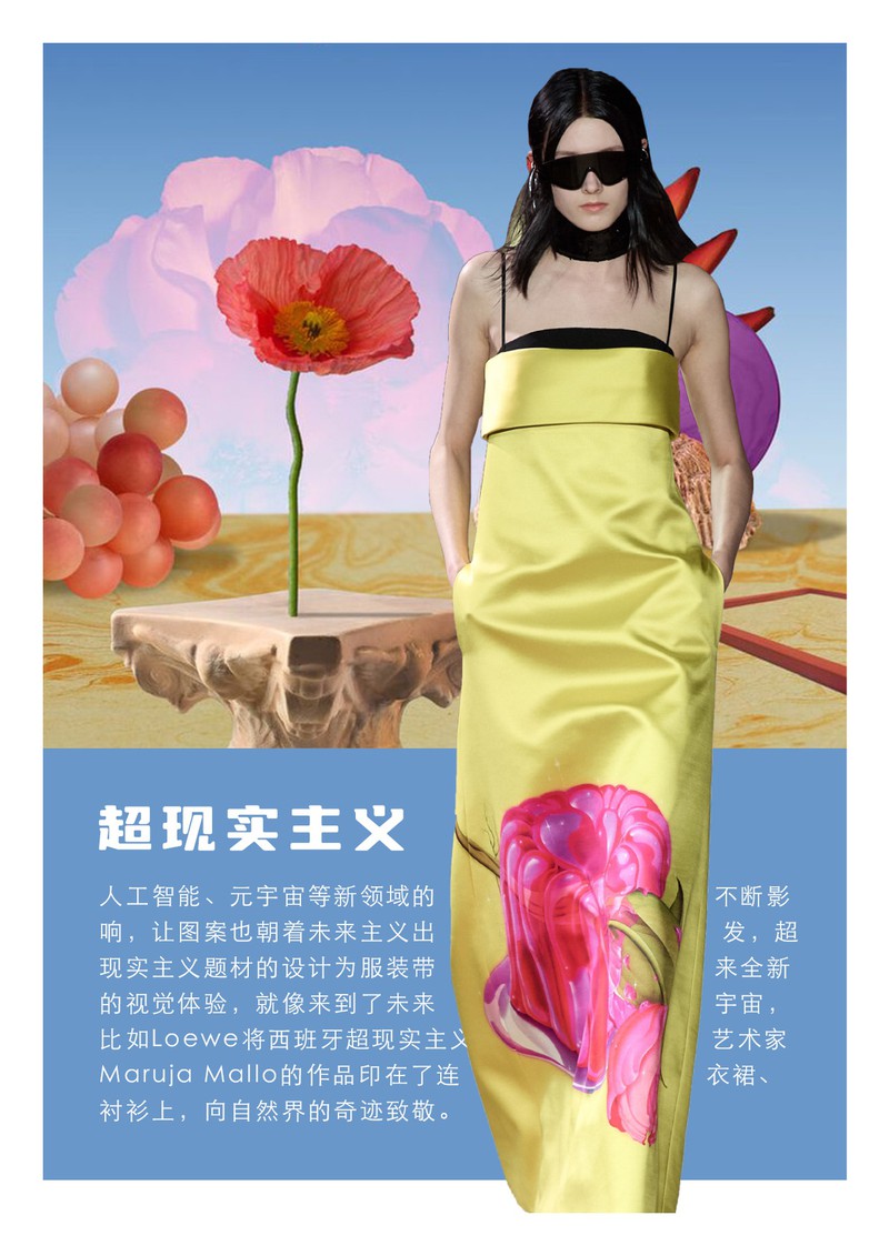 2025春夏印花&图案趋势:超现实主义人工智能、元宇宙等新领域的不断影响,让图案也朝着未来主义出发,超现实主义题材的设计为服装带来全新的视觉体验,就像来到了未来宇宙,比如Loewe将西班牙超现实主义艺术家Maruja Mallo的作品印在了连衣裙、衬衫上,向自然界的奇迹致敬。