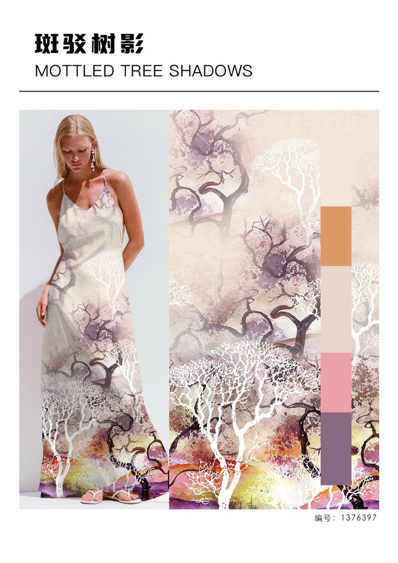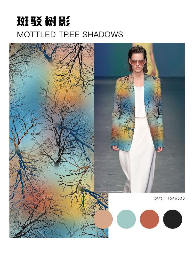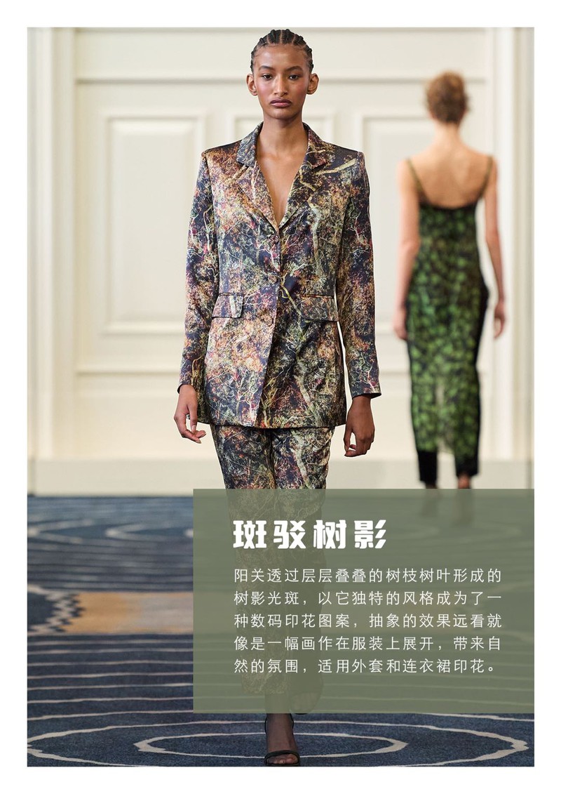 2025春夏印花&图案趋势:斑驳树影阳关透过层层叠叠的树枝树叶形成的树影光斑,以它独特的风格成为了一种数码印花图案,抽象的效果远看就像是一幅画作在服装上展开,带来自然的氛围,适用男女装外套和连衣裙印花。