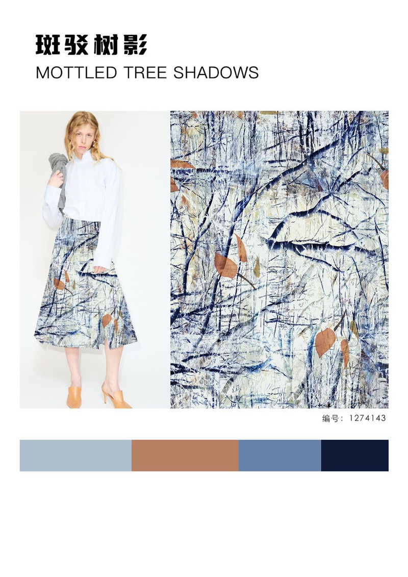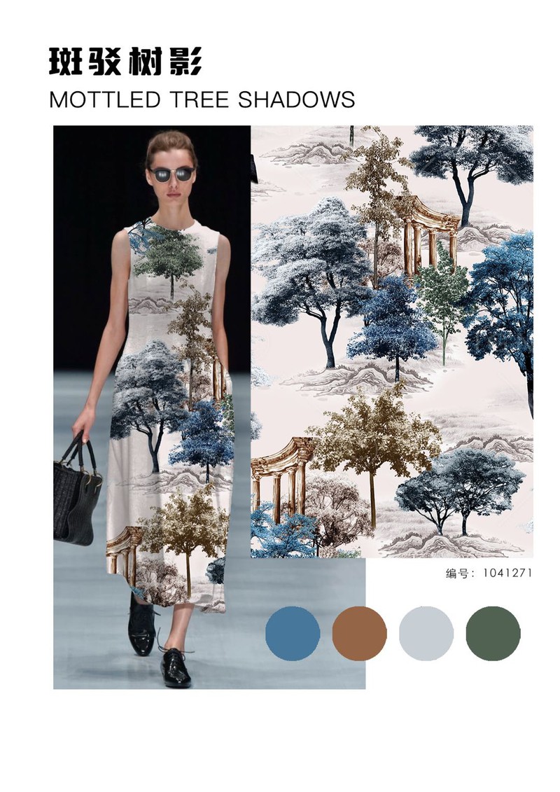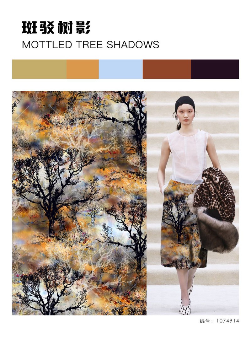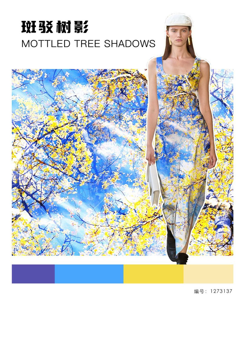 2025春夏印花&图案趋势:斑驳树影阳关透过层层叠叠的树枝树叶形成的树影光斑,以它独特的风格成为了一种数码印花图案,抽象的效果远看就像是一幅画作在服装上展开,带来自然的氛围,适用男女装外套和连衣裙印花。