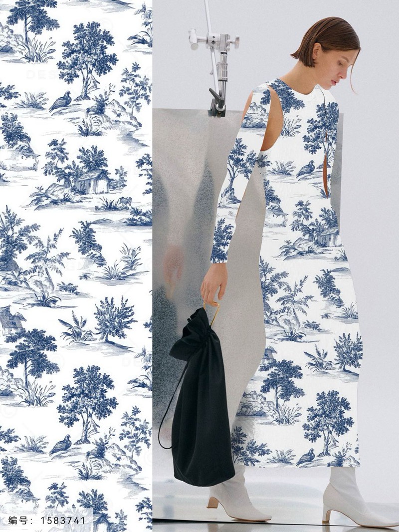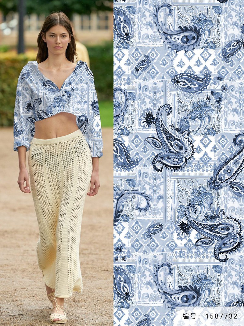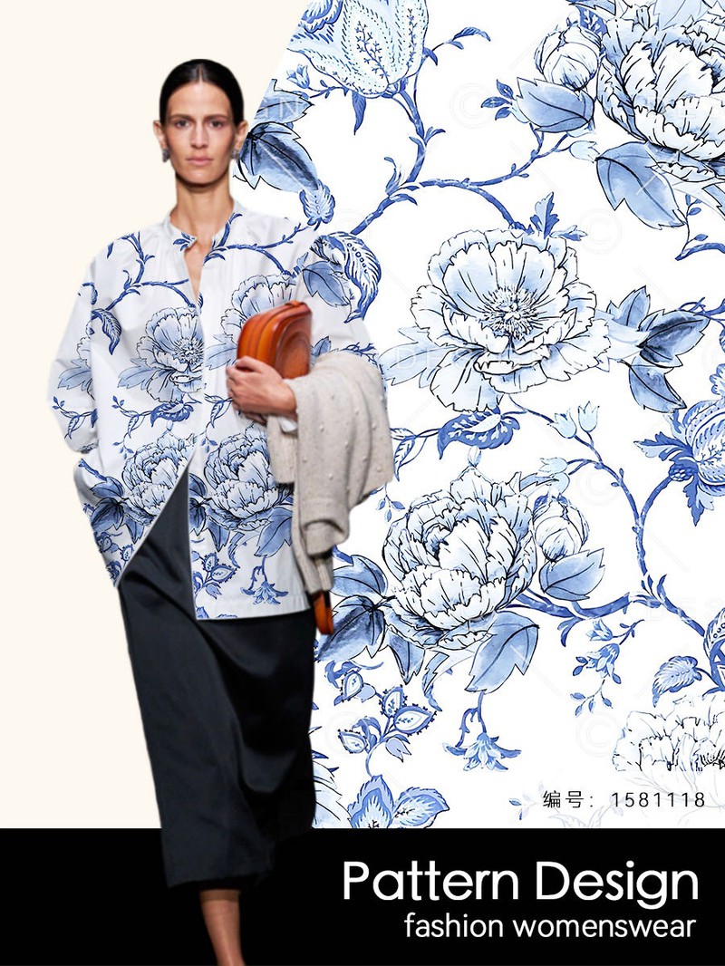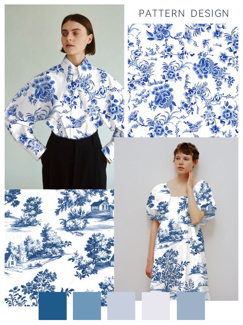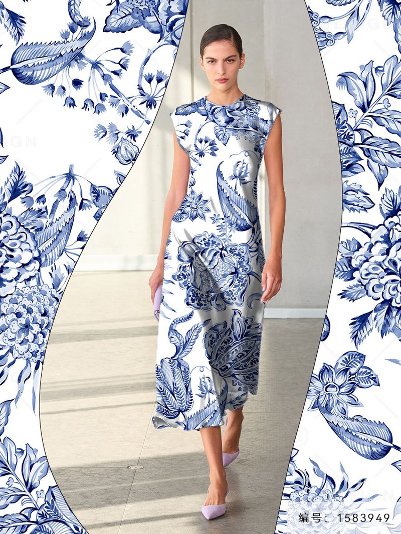 灵感来自朱伊纹、青花瓷的蓝白图案在2025年春夏也受到女装市场的欢迎,以它清新的色彩带来独特的设计,花卉、植物、风景、民族纹样都是可以融合的图案元素
