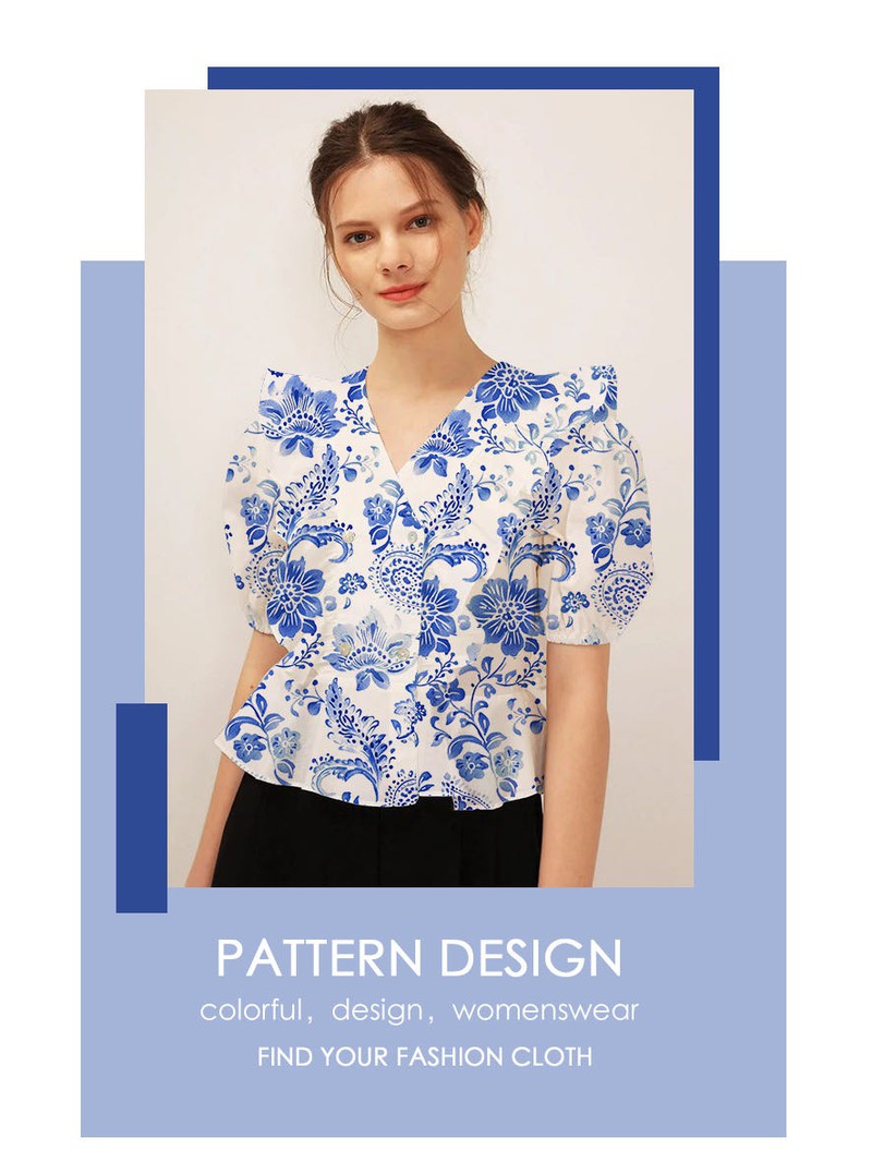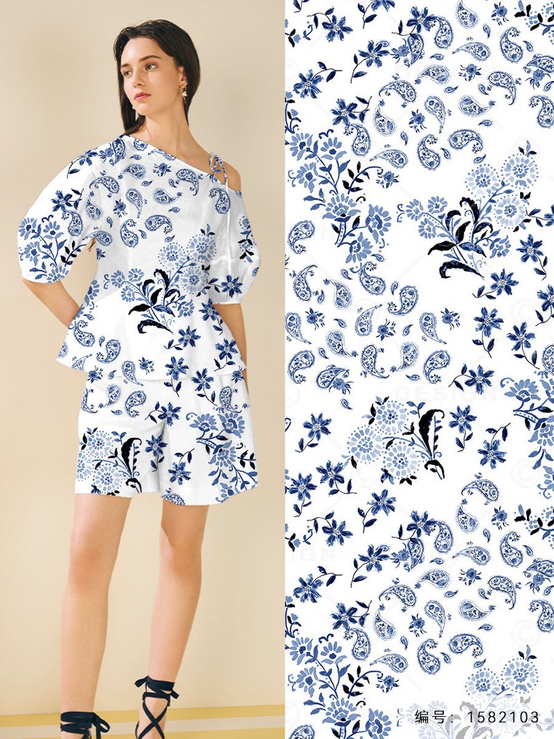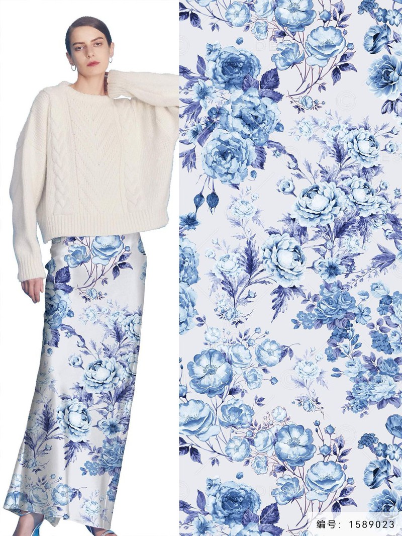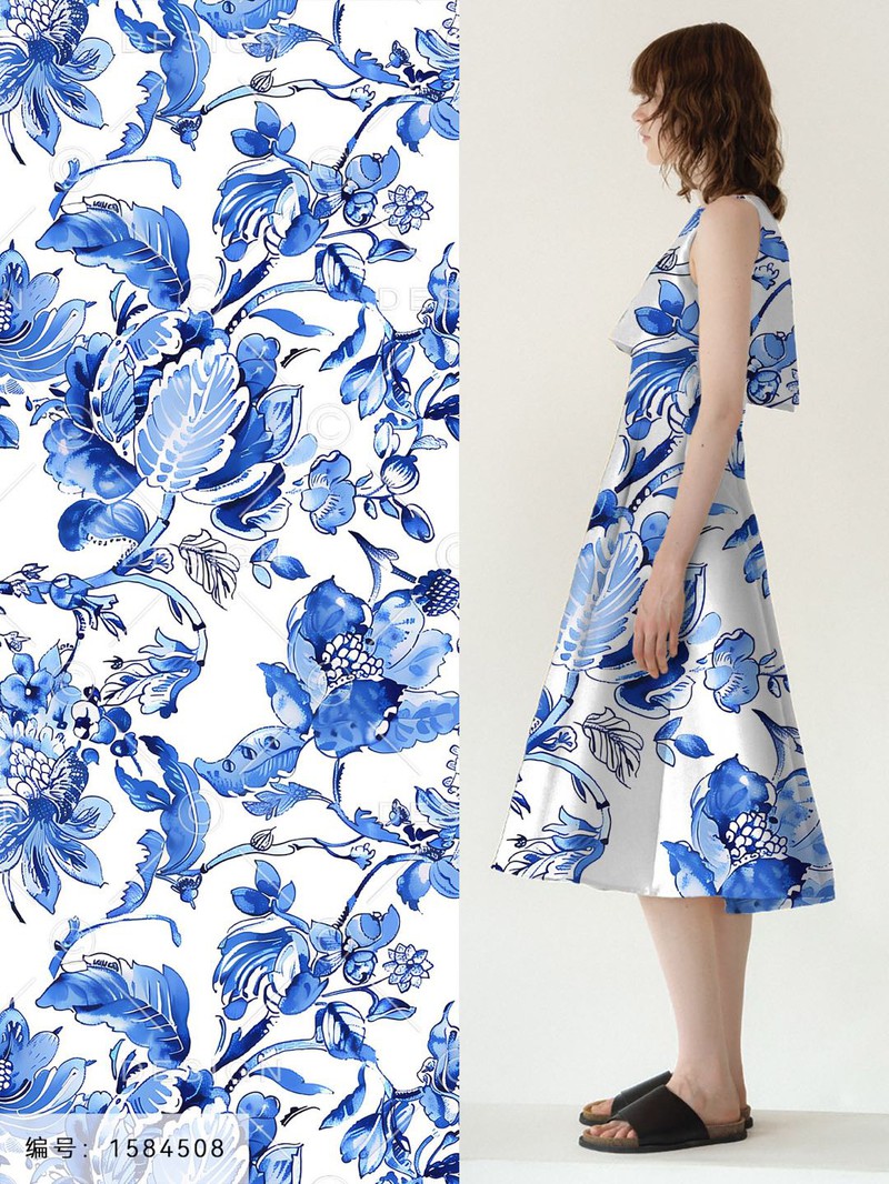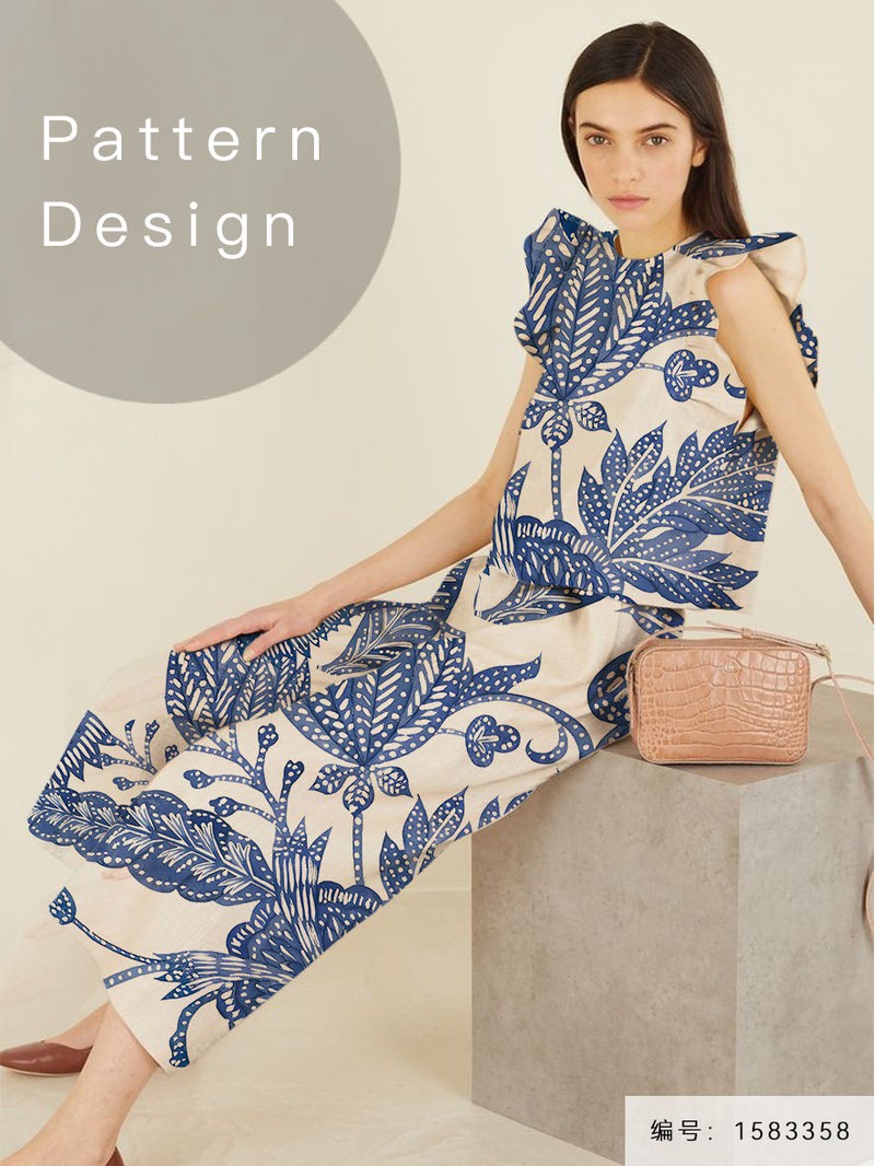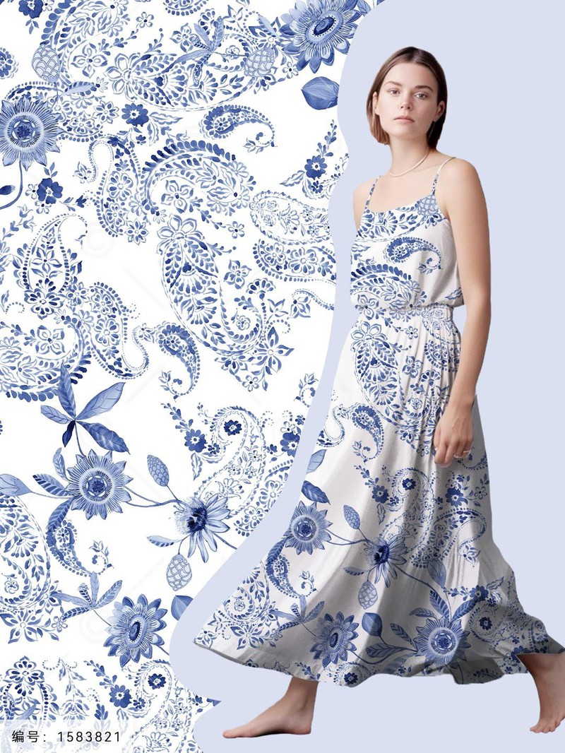 灵感来自朱伊纹、青花瓷的蓝白图案在2025年春夏也受到女装市场的欢迎,以它清新的色彩带来独特的设计,花卉、植物、风景、民族纹样都是可以融合的图案元素