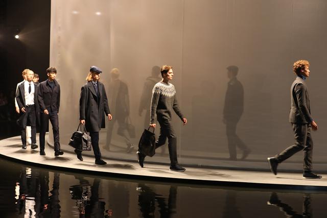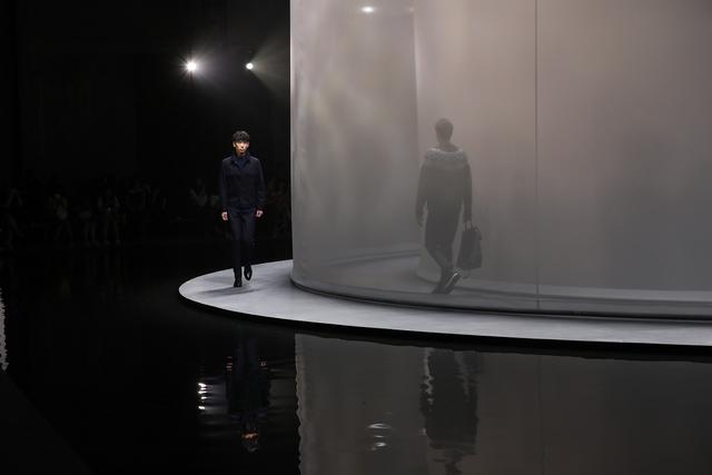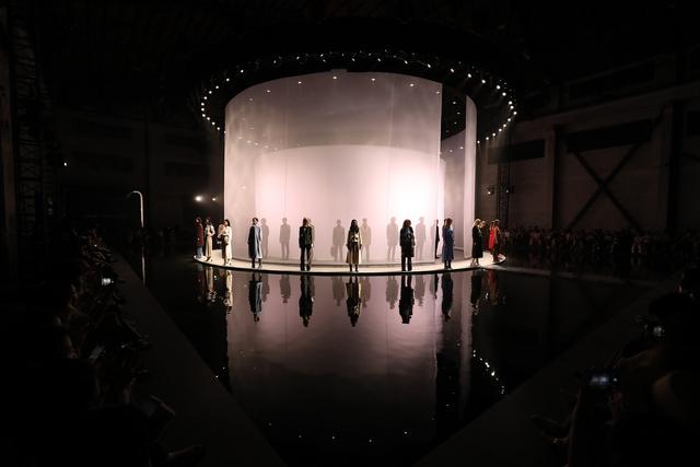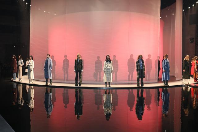 秀场空间十分宽阔,拥有先锋前卫的外观,内部天花板高耸,是Massimo Dutti举办时装秀活动的完美之选。主题为“The Art of Reflection”,这是一种美学主张,理念基于光影的复杂图案。光与影构成了整体图形的一部分。在光影变幻下,从一个饰以半透明墙壁的隔间内部,模特们的身影沿着以水幕作为背景的弧形伸展台缓缓走出。这时所有人都能看到人物修长的剪影,向我们展示着建筑与时尚完美融合在一起的独特时刻。举办此次活动代表着品牌又向前迈出一步,借助最新技术举办时装秀,始终走在创意的前沿。