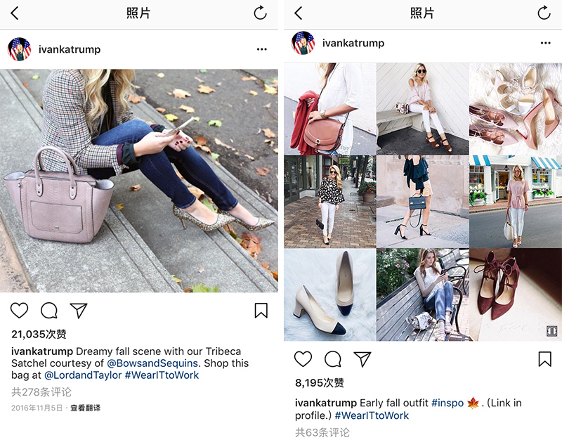 在 2016 年 11 月 22 日宣布社交媒体账号转为个人账号之前,伊万卡经常在社交媒体上给自家品牌打广告