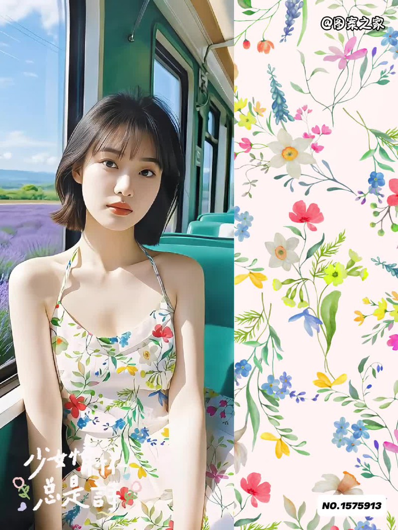 印花图案推荐-清爽碎花风格疾驰的列车上,窗外是一大片薰衣草,小姐姐享受着午后的美好时光。#小清新治愈系#印花连衣裙#写真#华亿平台设计 #美图分享