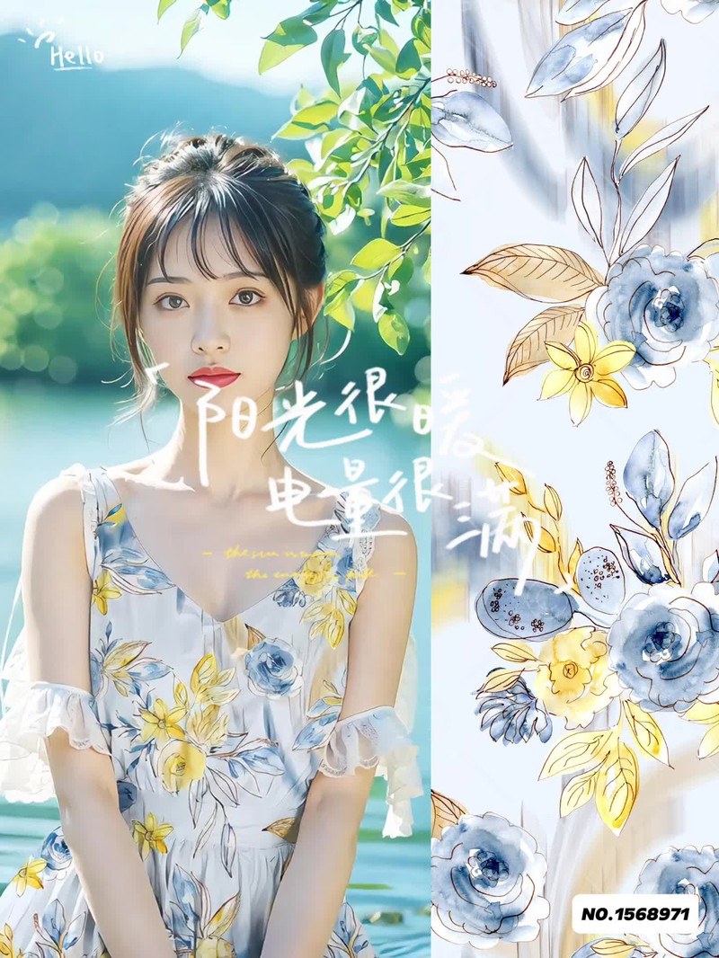 印花图案推荐-春夏花卉风格二期微风吹拂,站在河边的少女宛如一幅灵动的画卷。