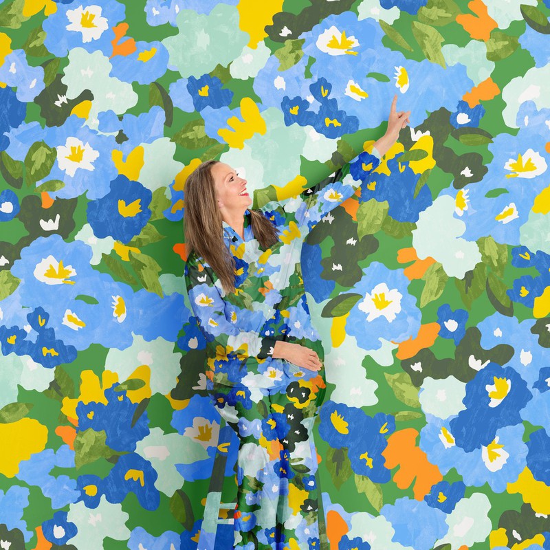 充满活力的夏日色彩盛开的花朵,鲜艳的色彩在绿色背景上绽放,是一款有趣而年轻的夏日印花,带来美妙的怀旧感。