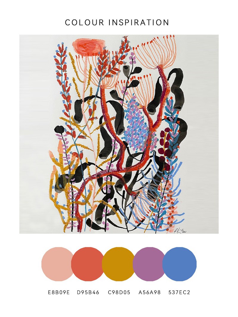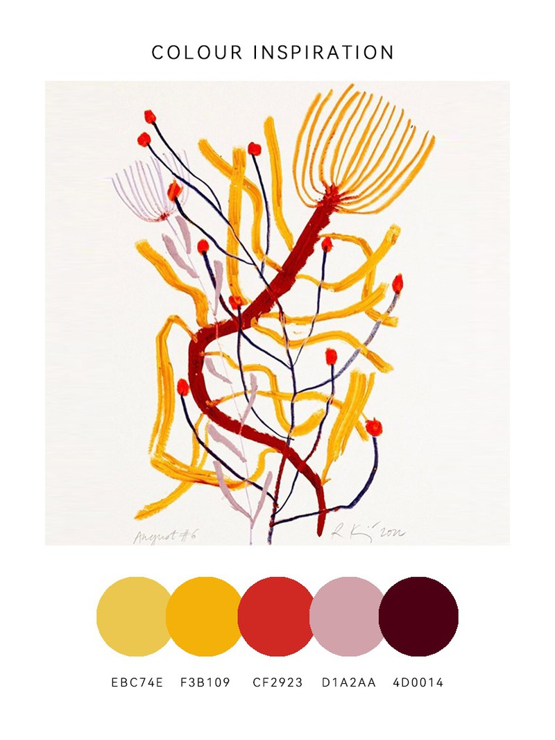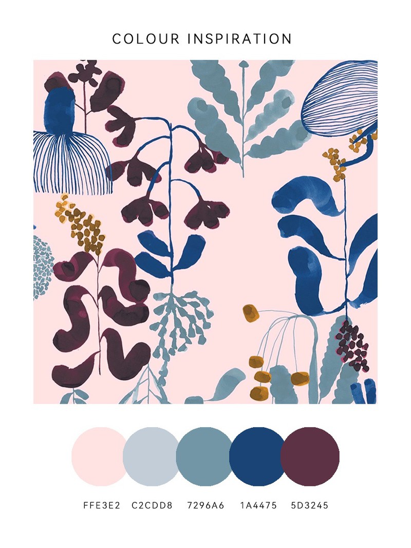芬兰赫尔辛基插画艺术家Réka Király的抽象和花卉图案设计充满了多样性和好奇心,灵感来自周围环境,比如树木投下的阴影、粗糙纸张上的笔触、路边的油菜田或洒出的茶渍。像秋日的微风一样,被霜冻触碰的植物呈现出柔和的棕色、李子色和冷蓝色,对大自然的安静致敬。她总是从手绘或水墨画元素开始,将奇特的形状与受北欧光线影响的颜色融为一体,虚构出一个由植物组成的秘密花园。