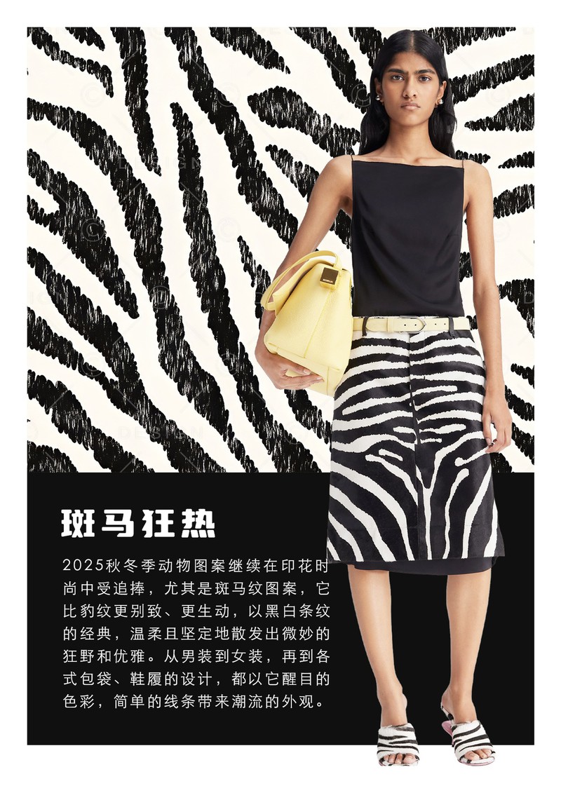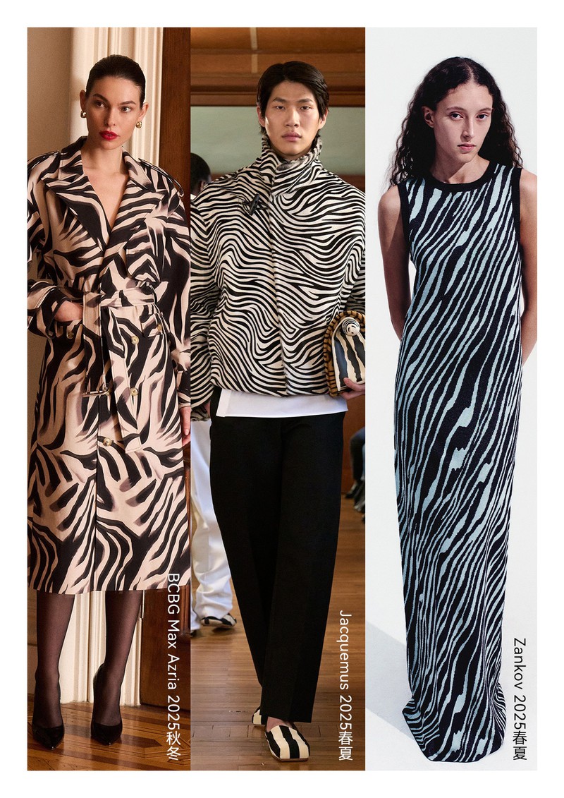 2025年秋冬印花&图案趋势:斑马狂热2025秋冬季动物图案继续在印花时尚中受追捧,尤其是斑马纹图案,它比豹纹更别致、更生动,以黑白条纹的经典,温柔且坚定地散发出微妙的狂野和优雅。从男装到女装,再到各式包袋、鞋履的设计,都以它醒目的色彩,简单的线条带来潮流的外观。
