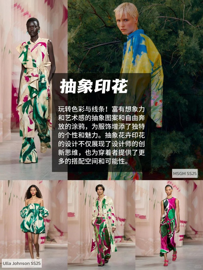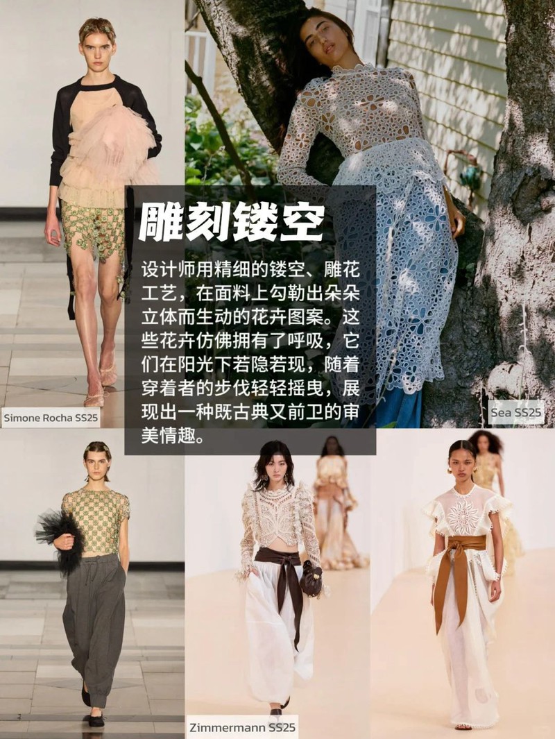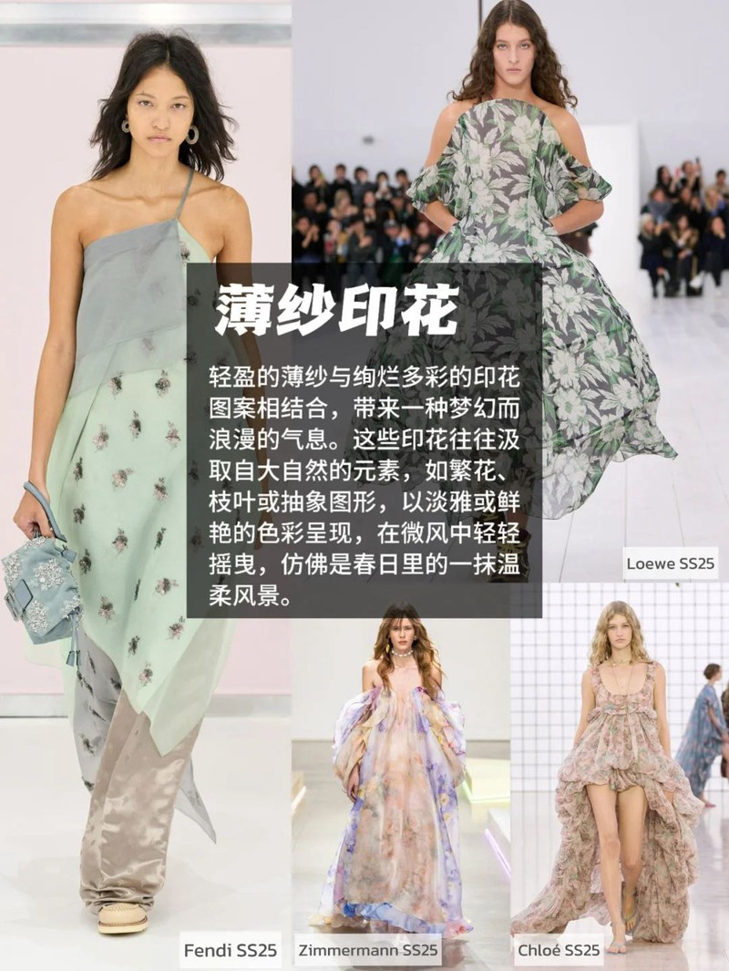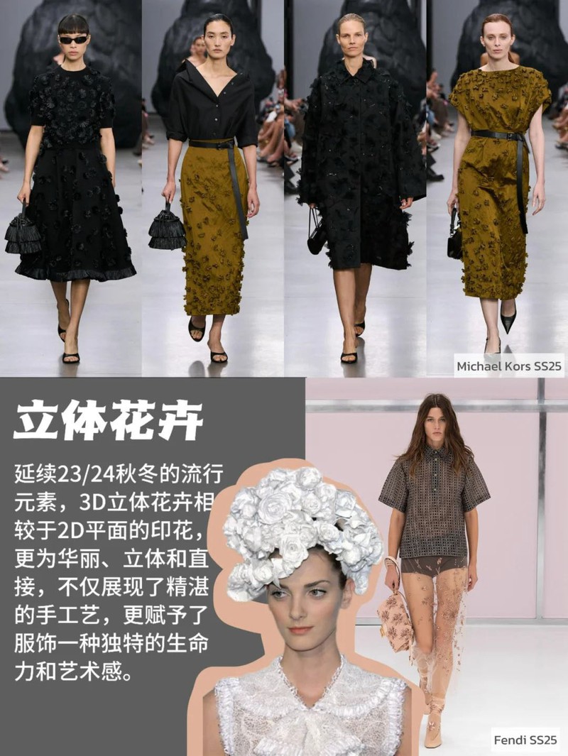 2025春夏的流行元素中,“花卉”元素可以说是重量级存在!从各大品牌2025春夏系列发布来看,用一句诗可以很好地概括——乱花渐欲迷人眼。 打破近两年来国际时装周秀场上极简主义的主旋律,2025春夏,浪漫、繁复的花卉元素再次成为时尚界的宠儿,各大品牌纷纷在其大秀中展示了各自对花卉元素的独特诠释,共同绘制了一幅绚烂多彩的花卉图案画卷,展现出一种更加生动活泼且富有生命力的设计风格。 这种转变反映了设计师们对于自然美的向往和探索,以及人们对色彩丰富性和视觉冲击力的需求逐渐增强的趋势。通过运用大量精致细腻的花朵图案以及层次分明的设计手法,这些作品成功地打破了传统季节的色彩限制,为即将到来的2025年春天注入了无限生机与活力。