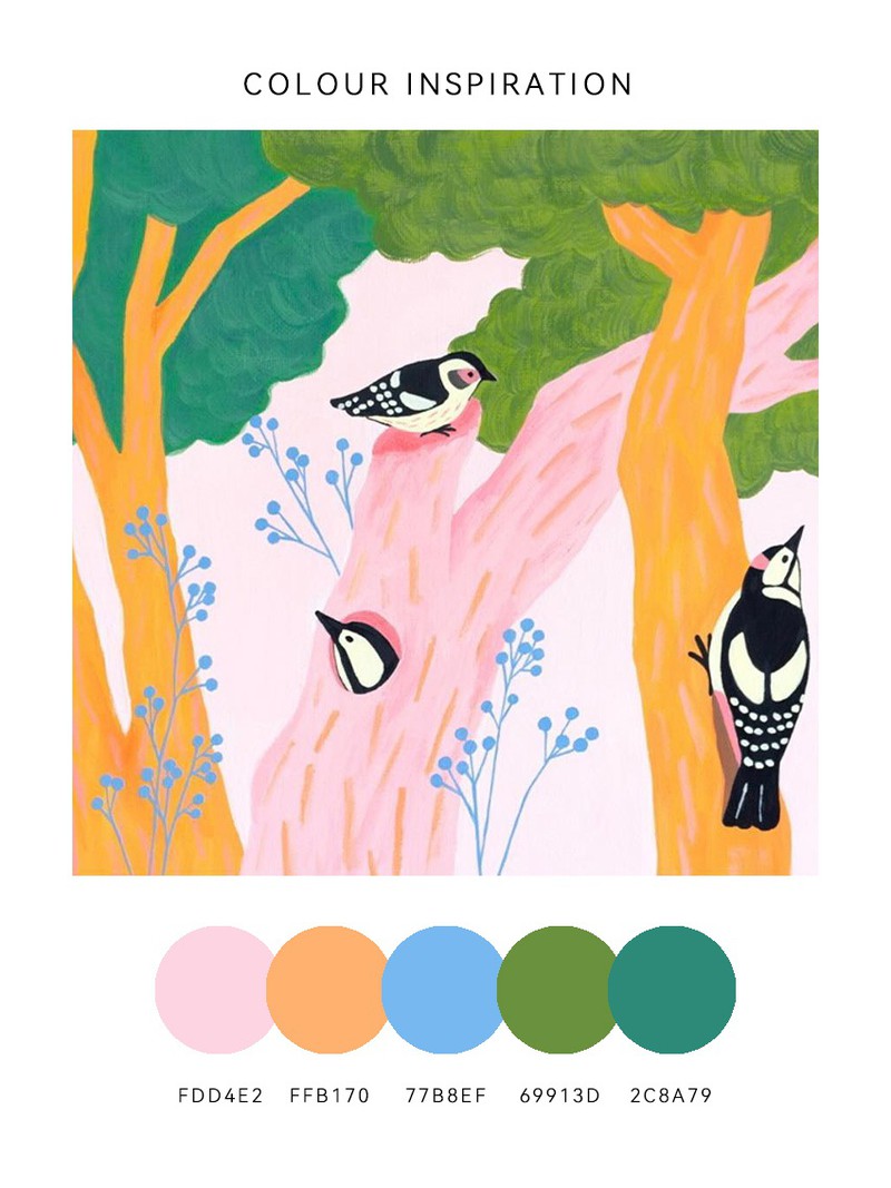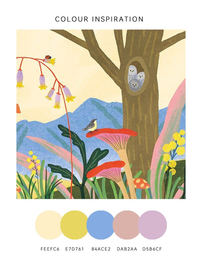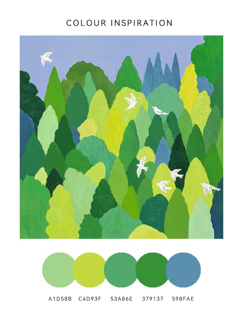配色灵感|韩国插画师SAI Woo多姿多彩的森林第一次看到韩国插画师SAI Woo的作品,就会被它们清新明媚的色调瞬间带入一个童话世界。绿色和蓝色的森林色调,搭配上明媚的黄色,所有的颜色都在展现生机。可爱的啄木鸟、山雀、白头鹎、喜鹊、麋鹿……仿佛在多姿多彩的森林中发出美妙的声音。