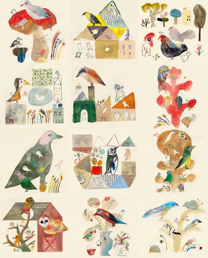 今日分享插画艺术家 @Estee.zales 的作品。以拼贴风格为特色,将手绘、水彩与拼贴元素相结合,并以鸟类为主题,创作出富有诗意的画面。 Estee Zales 的作品不仅仅是对鸟类的简单描绘,更巧妙地融合了建筑、植物、几何图形等元素,使画面充满故事感。每只鸟似乎都承载着不同的情感和象征意义,或许暗示着迁徙、家园、自由,甚至人与自然的关系。 拼贴手法独具美学特色,可能使用了旧书页、报纸、印刷材料等素材,再搭配手绘的细腻笔触,使几何形状、拼贴纹理和绘画元素交错融合,赋予作品层次感与手工质感。 色彩方面,偏好柔和的复古色调,如背景中的米色、画面中的色彩营造出温暖而梦幻的氛围。每个拼贴作品似乎都像是一则视觉日记,记录着插画师的创作心境或对自然的观察。譬如很喜欢图③,Estee Zales写到:“鸟儿悠然自得,而我却百感交集”。