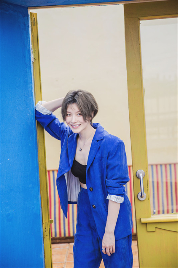 修身西服套装在蓝色的包围下也多了几分时尚感,不再是单调的黑白灰,似乎更有气场了呢!