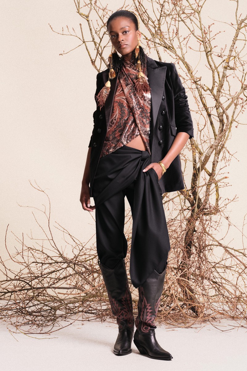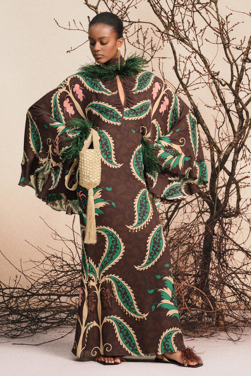 Johanna Ortiz是一个聚焦于传统手工艺的奢侈生活方式品牌,这次的2025秋冬系列,灵感来源于一位神秘而优雅的收藏者,标志性的印花图案源自前哥伦布时期文化的丰富工艺和象征意义,与装饰艺术运动那种极致奢华的风格相契合,今年正值装饰艺术运动百年诞辰。巧克力色、祖母绿、酒红和黑色的饱和色调与复杂的图案和丰富的对比形成了鲜明的对比。整场秀中,诸如木兰花、西番莲以及受设计师在卡利日常所见启发的标志性棕榈树等花卉图案,旨在唤起力量与优雅的特质。以及对牧场风格图案的演绎到充满活力的 70 年代风格印花,一套全金色的套装,带有精美的扇形图案,仿佛是用珍贵金属打造而成,哥伦比亚的手工艺,带有魔幻现实主义色彩。