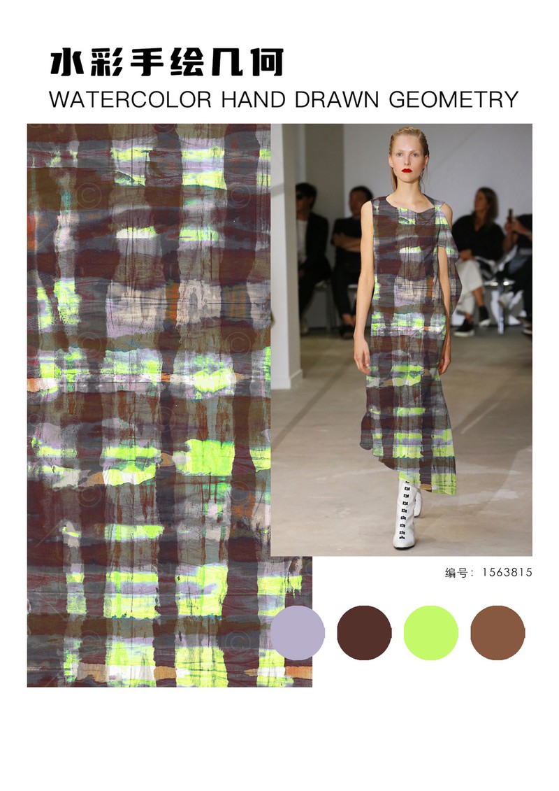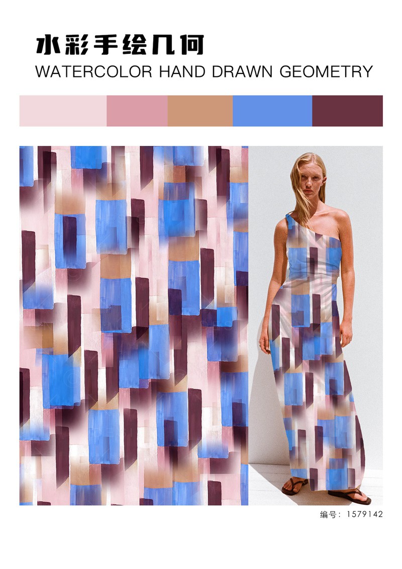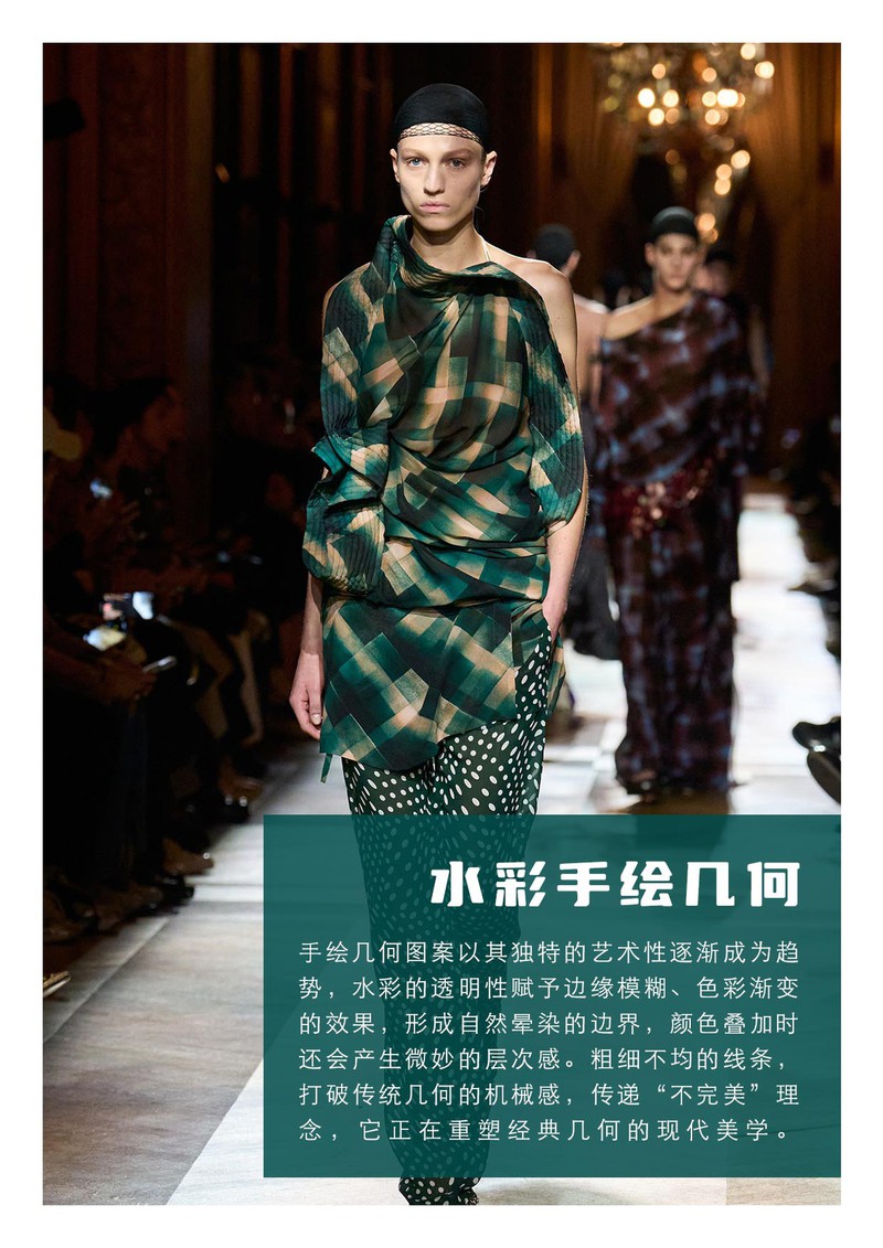 2025秋冬印花&图案趋势:水彩手绘几何手绘几何图案以其独特的艺术性逐渐成为趋势,水彩的透明性赋予边缘模糊、色彩渐变的效果,形成自然晕染的边界,颜色叠加时还会产生微妙的层次感。粗细不均的线条,打破传统几何的机械感,传递“不完美”理念,它正在重塑经典几何的现代美学。