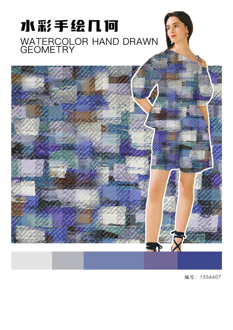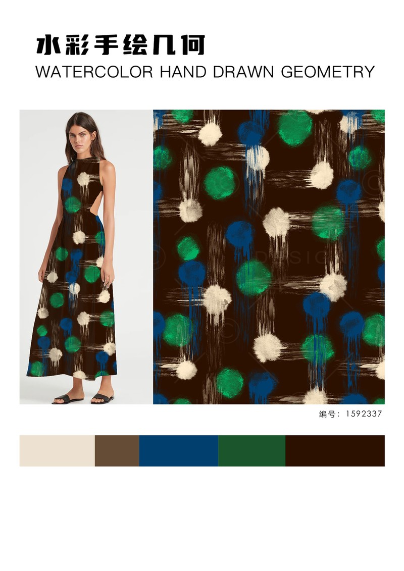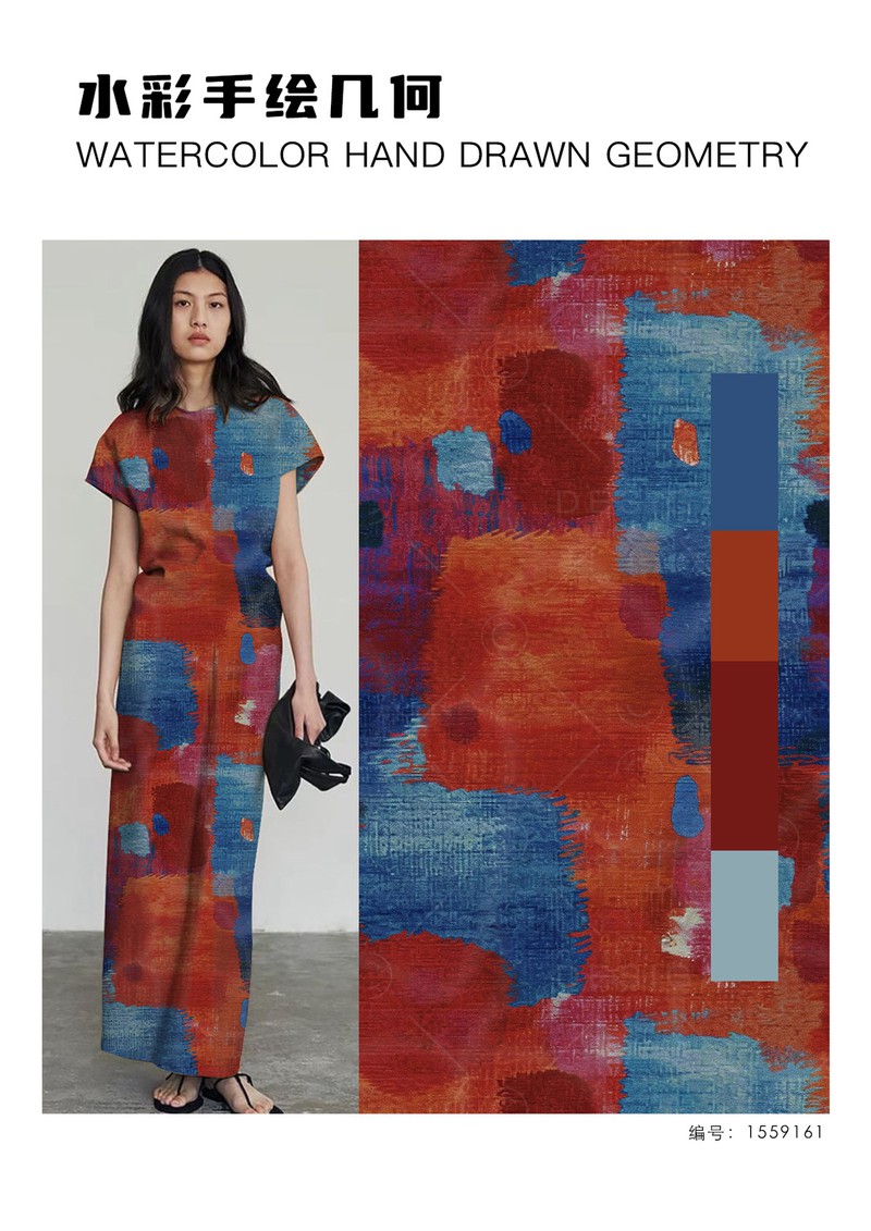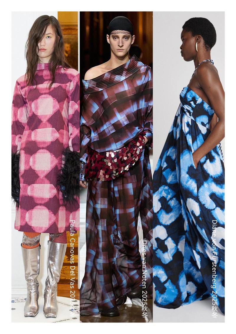 2025秋冬印花&图案趋势:水彩手绘几何手绘几何图案以其独特的艺术性逐渐成为趋势,水彩的透明性赋予边缘模糊、色彩渐变的效果,形成自然晕染的边界,颜色叠加时还会产生微妙的层次感。粗细不均的线条,打破传统几何的机械感,传递“不完美”理念,它正在重塑经典几何的现代美学。