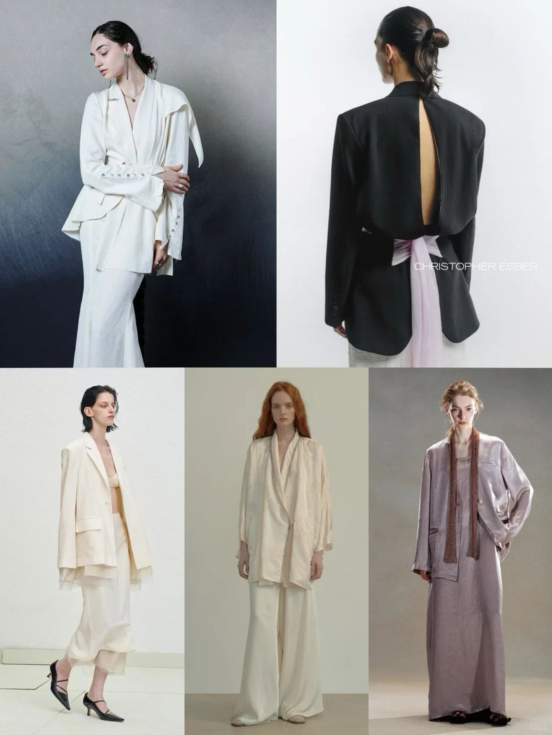 3. 柔韧廓形西装改良英伦剪裁融合旗袍立领,通过缎面拼接弱化凌厉感。肩部曲线雕塑与后背脊柱线强化设计,塑造柔中带刚的新职场女性画像。