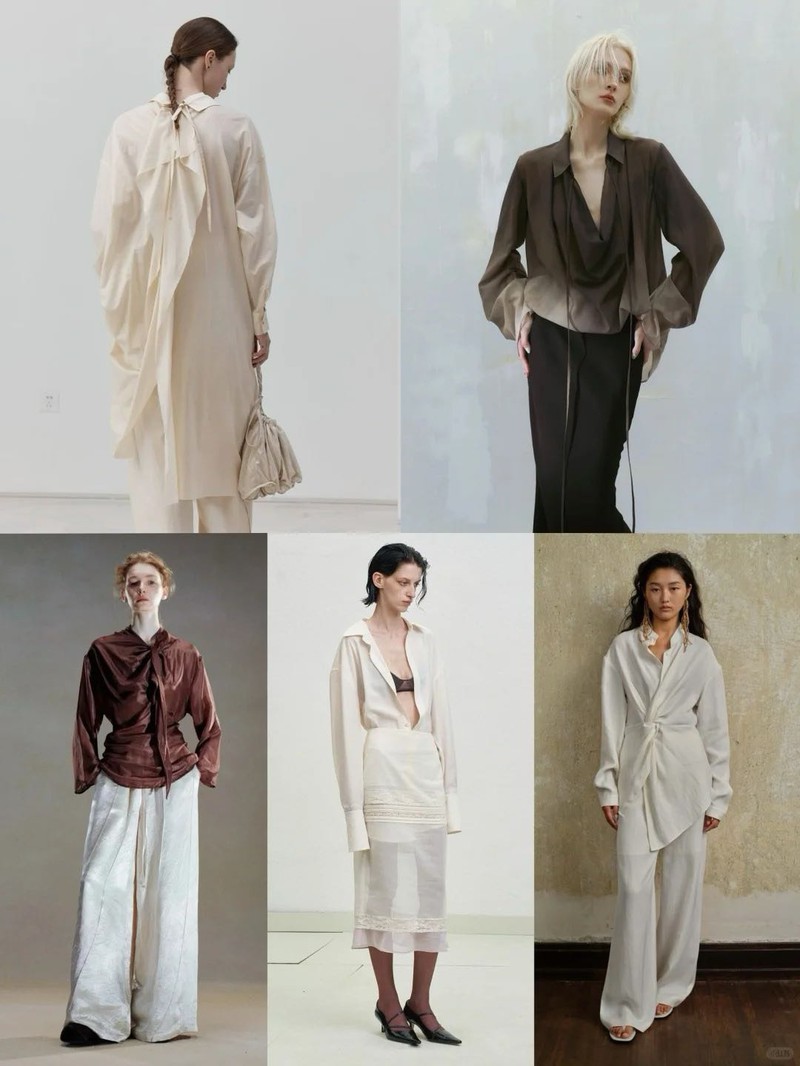 ▍爆款单品 1. 云感柔光衬衫用天丝与桑蚕丝打造流动光影,创新落肩剪裁打破传统版型。领部褶皱与袖口微喇设计重构身体比例,半透明肌理呈现克制的性感表达。