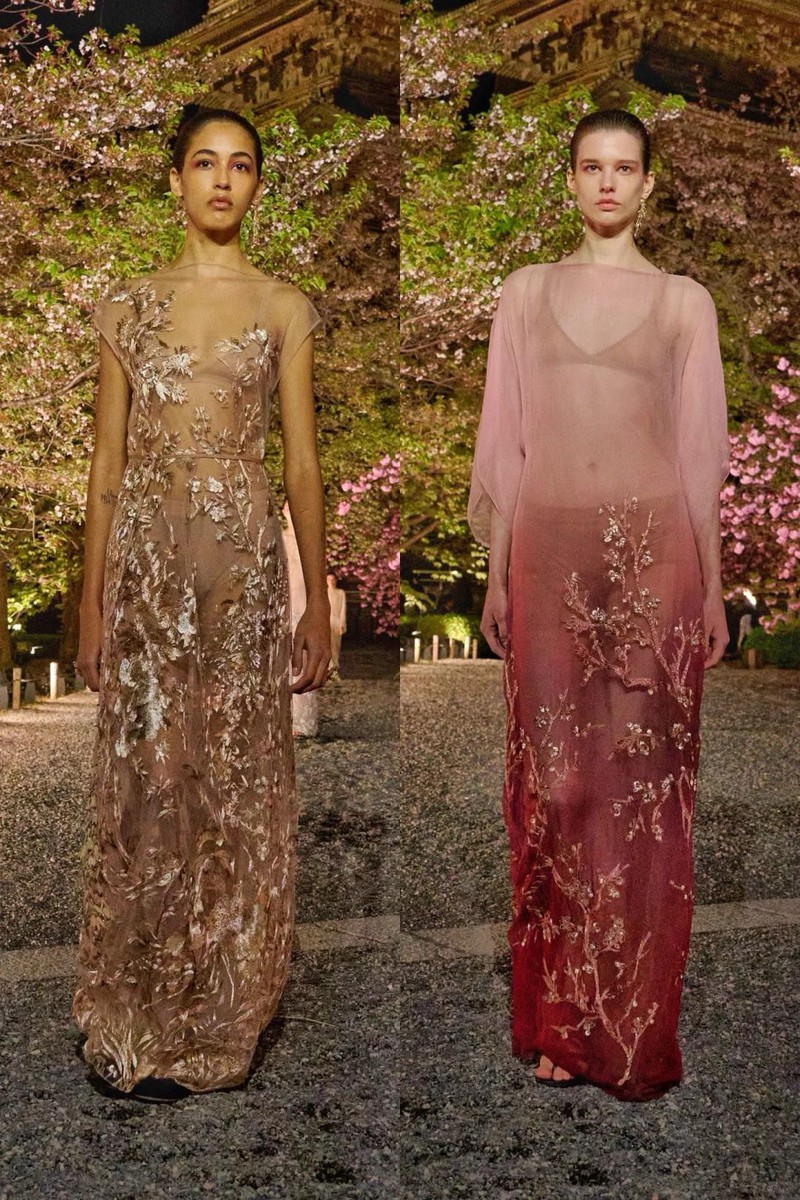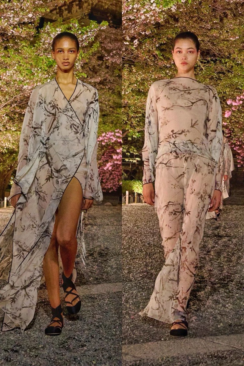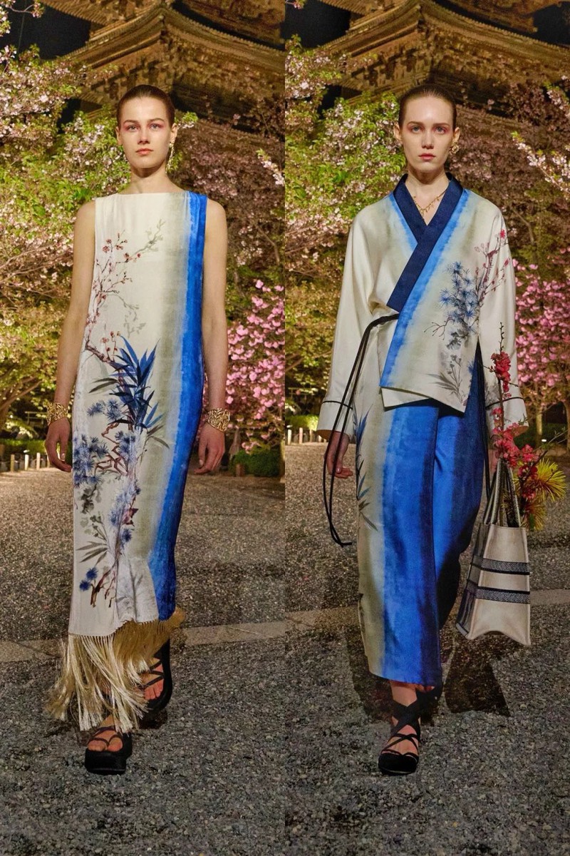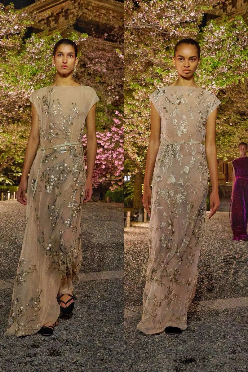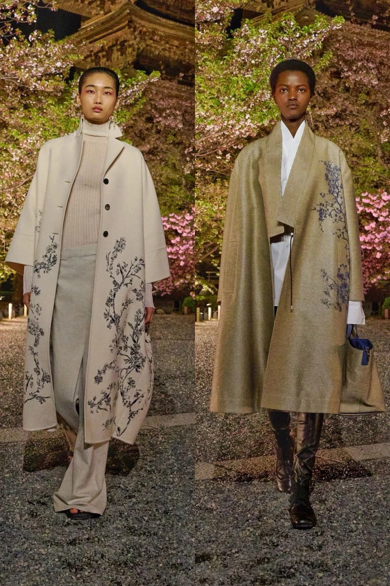 蔻丽延续了迪奥与日本的联系,选择京都作为早秋系列的发布地。她在东寺花园的樱花下举办时装秀,探索传统与创新的融合。 蔻丽深入研究和服的美学,其二维平面设计与西方三维裁剪形成鲜明对比。她强调和服如何通过服装与身体的对话来表达自由与神秘感。 蔻丽与日本传统工匠合作,如Tatsumura纺织工坊,该工坊以制作和服腰带和仪式服装闻名。她还与染色大师合作,将日本花卉图案手工刺绣或印染在服装上。 系列中既有传统的和服式外套,也有现代的运动风格单品,如带有樱花图案的宽松夹克和牛仔连体衣。设计中融合了日本传统图案与现代几何元素。 时装秀展示了精湛的高级定制工艺,如手工编织的锦缎和手工刺绣的花卉图案。在东寺的樱花树下,观众如莉莉·詹姆斯等名人欣赏了这场宁静而优雅的时装秀。 迪奥品牌与日本文化的结合不仅是对传统美学的致敬,也是对现代时尚的创新探索。玛丽亚·嘉茜娅·蔻丽通过与日本工匠的合作,将传统工艺与现代设计完美融合,展现了迪奥品牌对文化传承与创新的承诺。