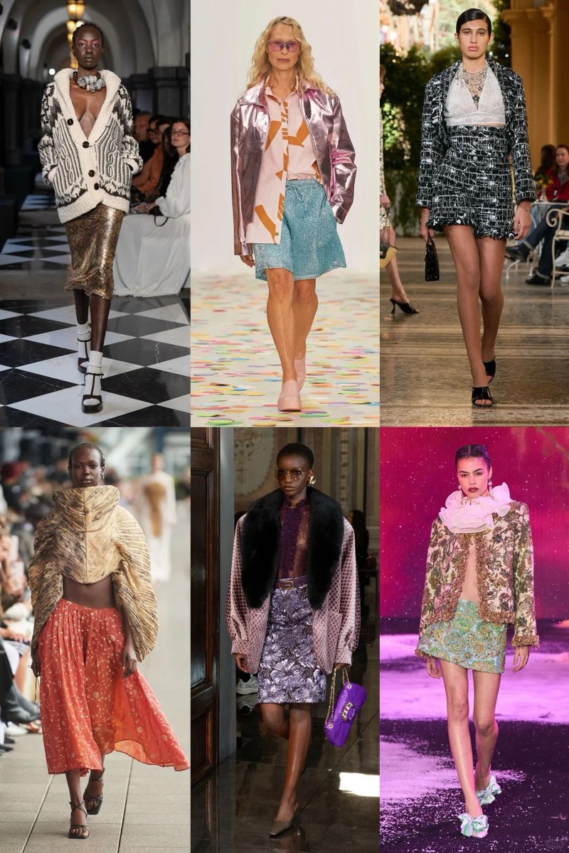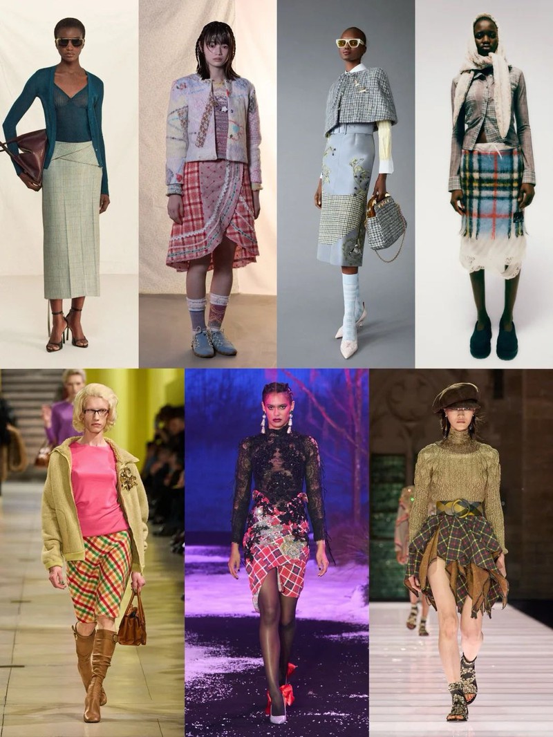 2026/27 秋冬,女装图案设计以 “几何交响” 为主题,奏响动态线条与几何秩序的融合乐章。它巧妙地将抽象主义与科技工艺相结合,以波浪纹的金属光泽、立体刺绣几何图案,展现 “交响” 般的视觉盛宴,同时呼应复古格纹的进化与暗黑浪漫的叙事性,实现从视觉冲击到情感共鸣的升级。这一主题完美平衡了科技与手工艺的冲突美学,满足了年轻消费群体对 “可穿戴叙事” 的需求。 ▍关键图案:怀旧格纹怀旧格纹在本季重焕生机,成为复古英伦气质与未来主义剪裁碰撞的火花。从厚重呢料到光感织物,格纹以多维度的方式展现其不朽魅力,将学院气息与摩登风范完美融合。改良轻盈流畅的发光面料,解构设计打破传统,打造先锋前卫的视觉效果。这种新旧融合的格纹,为秋冬造型注入了一份独特的气质。