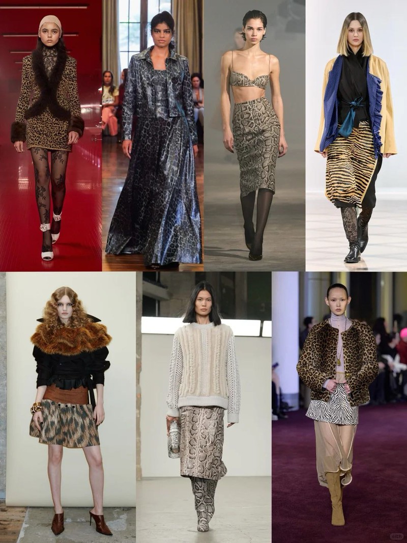 ▍关键图案:另类兽纹兽纹以更丰富的材质呈现,打破传统印象,释放无法驯服的个性魅力。柔软绒面、闪耀亮片、科技感涂层等材质创新,使兽纹在奢华与街头风格之间游刃有余。这种大胆创新的兽纹,为秋冬造型注入了一份野性与奢华并存的独特魅力。