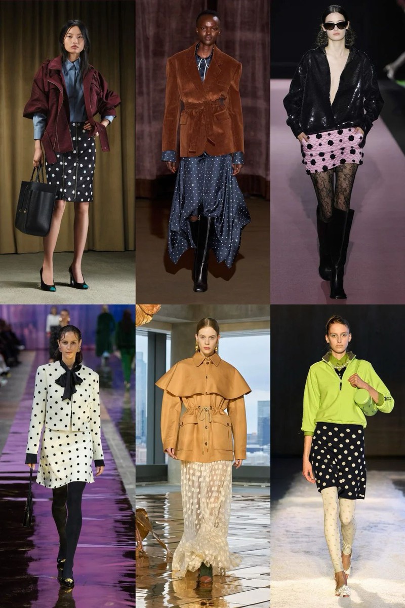▍关键图案:复古波点波点图案在秋冬绽放别样韵味,演绎从经典复古到前卫现代的无限可能。大波点展现戏剧张力,小波点则渲染精致优雅。黑白对比、金属光感、立体肌理等多种工艺提升波点的视觉趣味,为冬日造型增添一丝俏皮感。