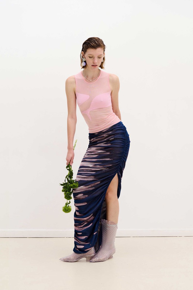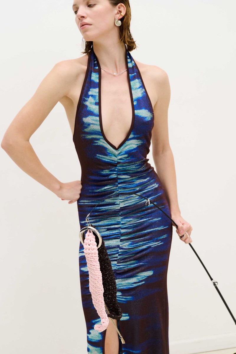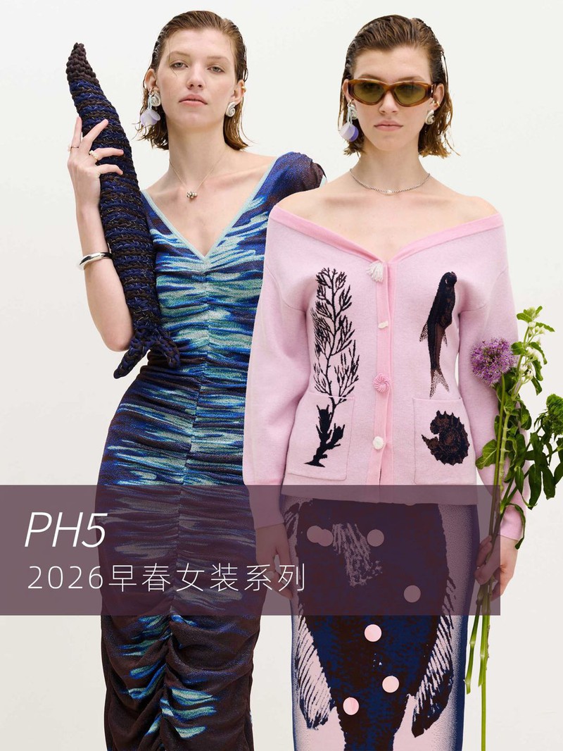 PH5是一个年轻的品牌,一直在拓展其产品类别,本次2026度假系列的新品包括网眼上衣、通过将网眼与针织相结合来玩转透明度的单色造型以及反光款式。在尝试了秋季压花的创意之后,设计师继续探索不同的压印和印刷形式,以及除照片之外的其他记录方式。最终选定了古老的日本鱼拓艺术,即渔民将鱼涂上墨水然后压在纸上制成印画,这为整个系列提供了鱼类主题,最直观的体现就是一条鱼形提花裙。不透明的鱼形图案环绕着裙身,为穿着网眼上衣的女士们遮挡了身体。亮片和热压的水钻则玩味着鱼鳞的闪光效果,而带有 Lurex 的针织面料则捕捉到了水面的波光粼粼,其在编织过程中形成的褶皱模仿了水波纹,这是对主题的有效延伸和抽象。