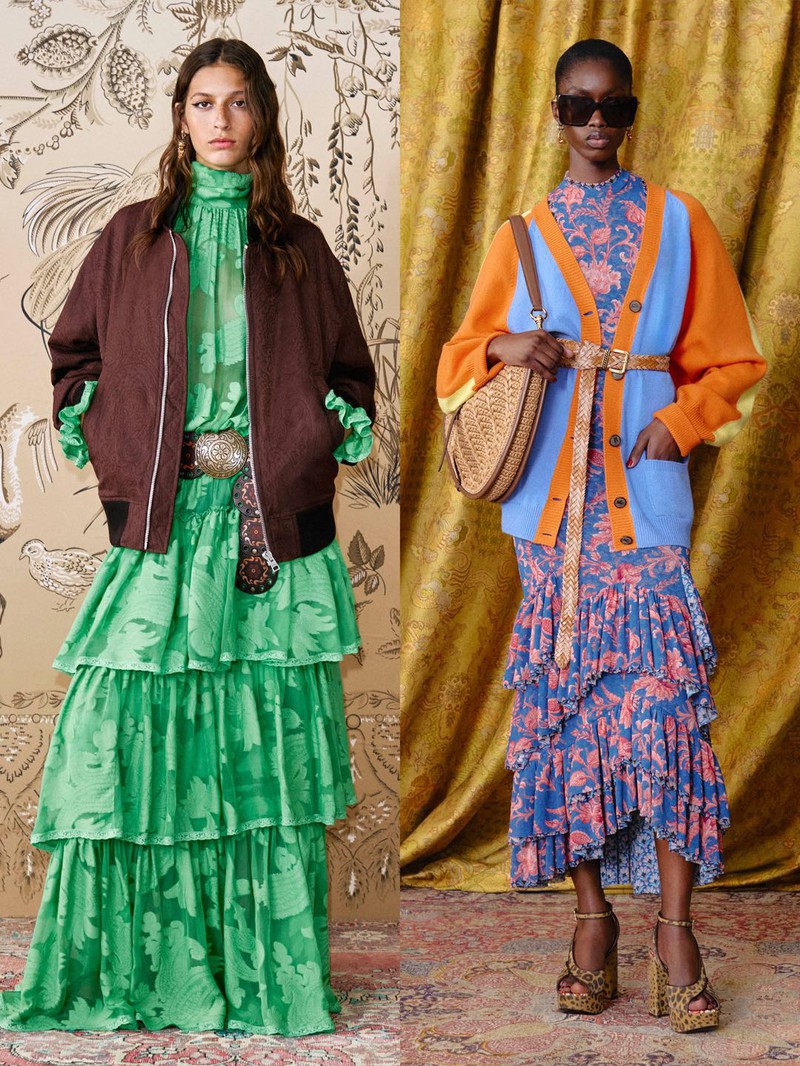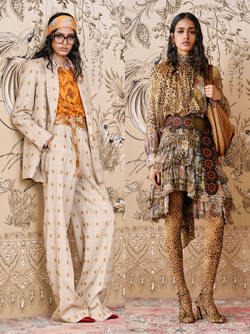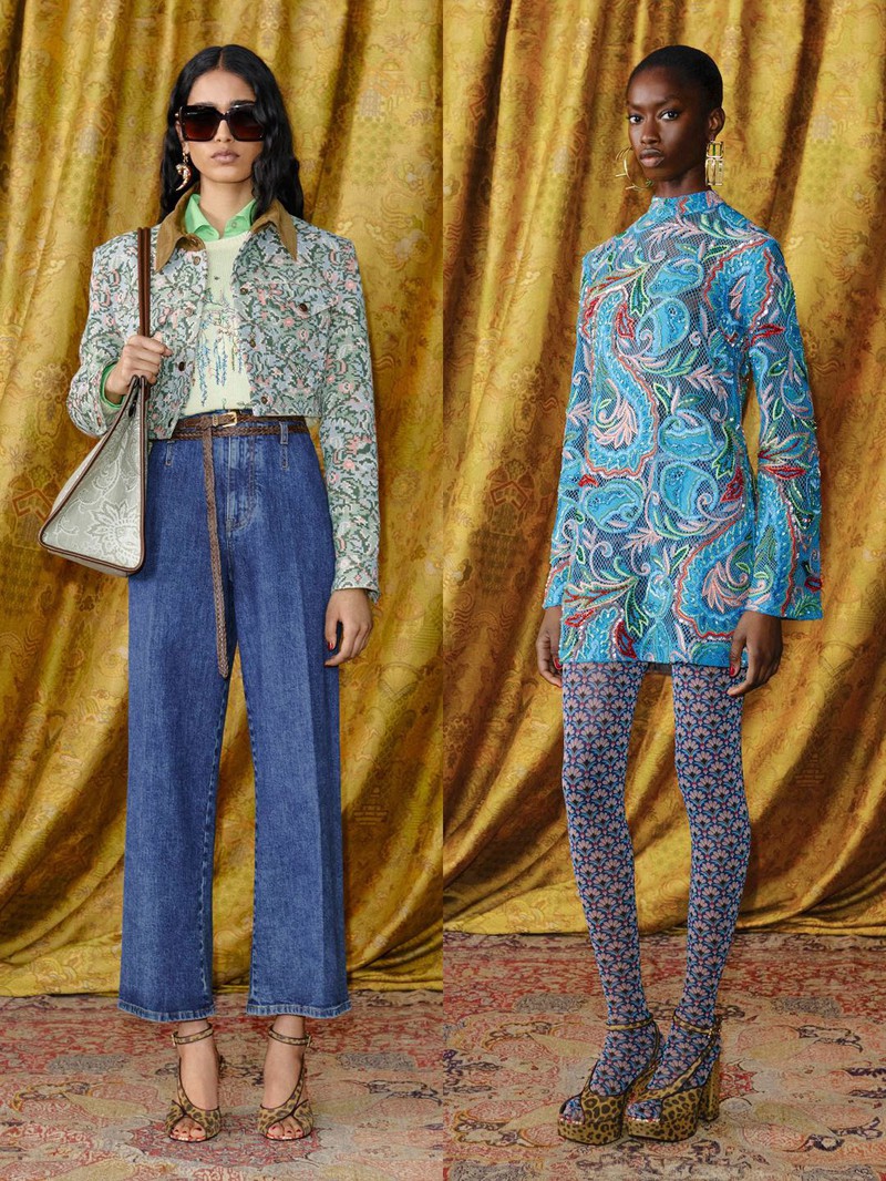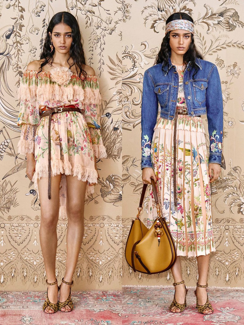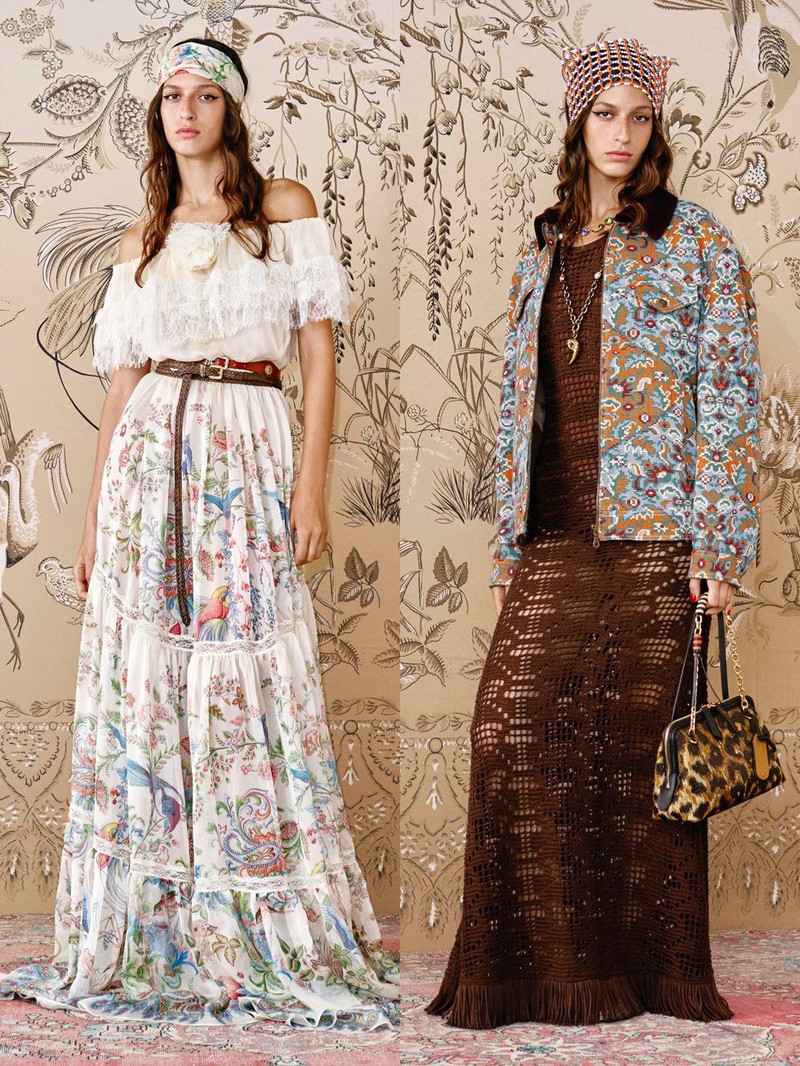 Marco de Vincenzo一直对装饰艺术有着独特的天赋,他对极度张扬的视觉效果的处理方式更偏向于动态和概念化,而非华丽繁复。在Etro公司工作的三年里,他发现自己置身于一种不同的节奏之中:一种女性化且充满波西米亚精神的节奏。对于此次的设计主题,他借鉴了Etro一贯采用的印花与图案搭配的风格,融入了大量褶边和波浪裙摆的设计元素、复杂的蕾丝镶嵌图案、70 年代风格的元素,以及在飘逸的女士纱裙之上叠加印花尼龙锦缎。