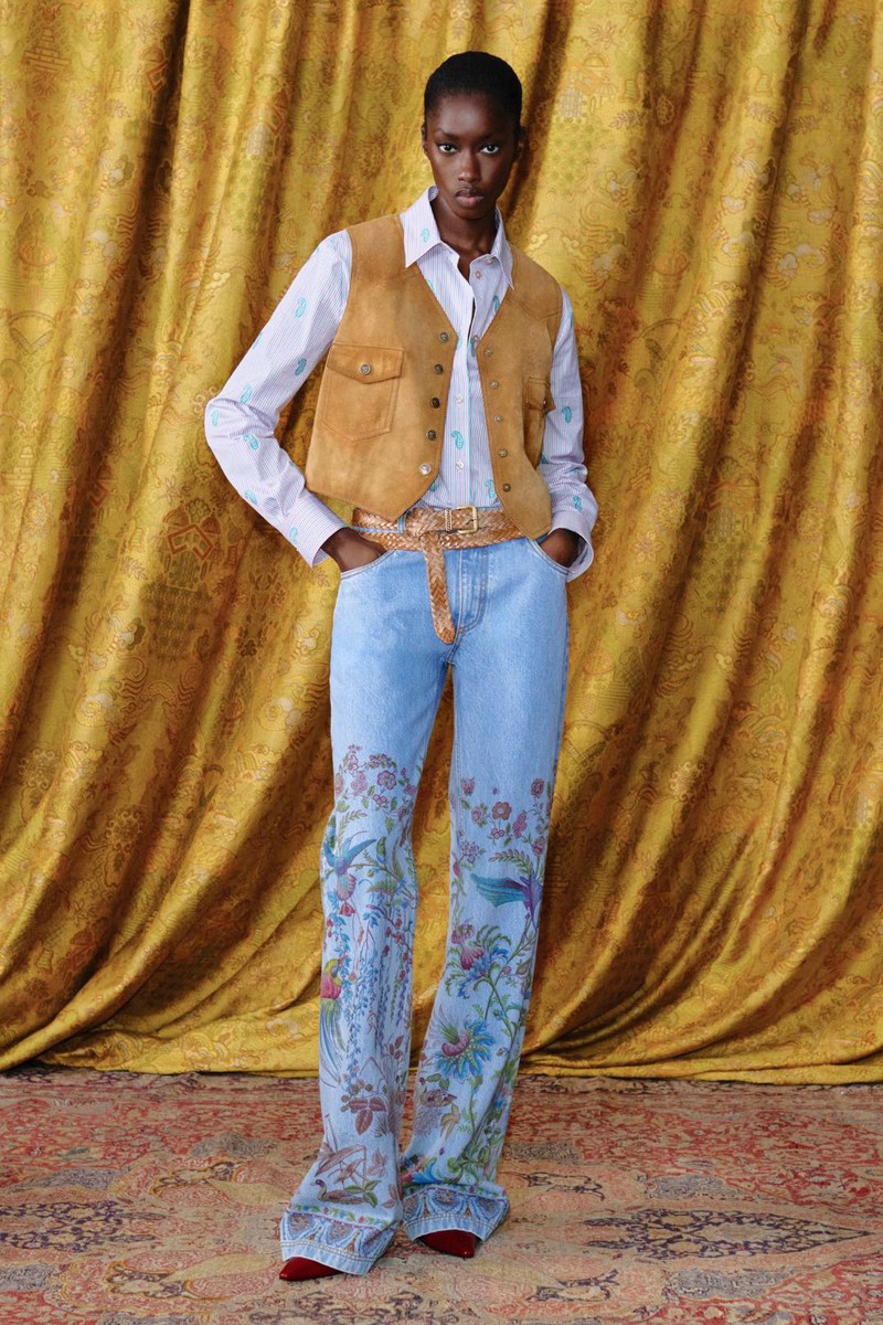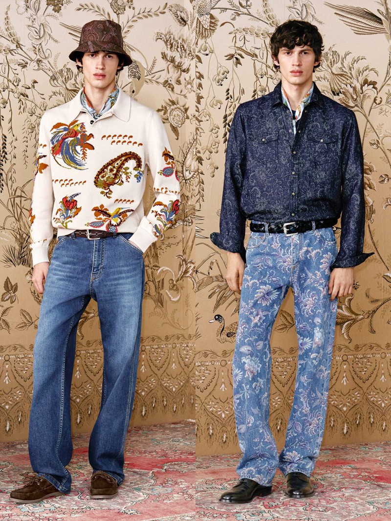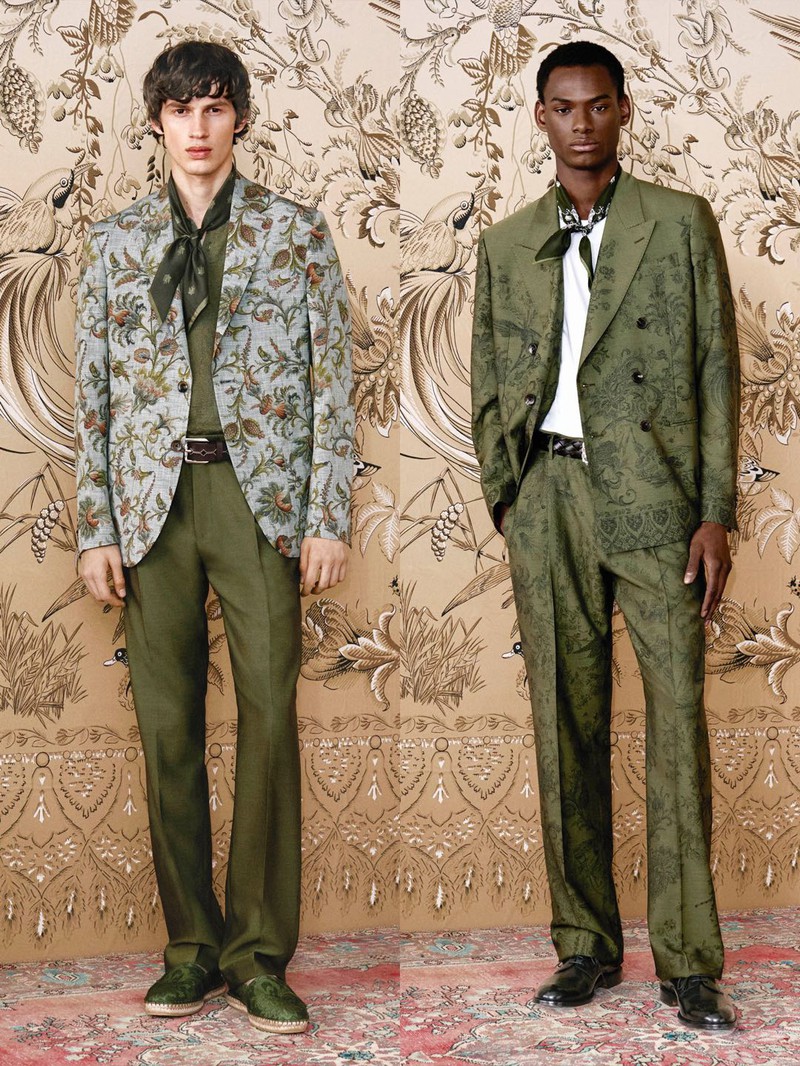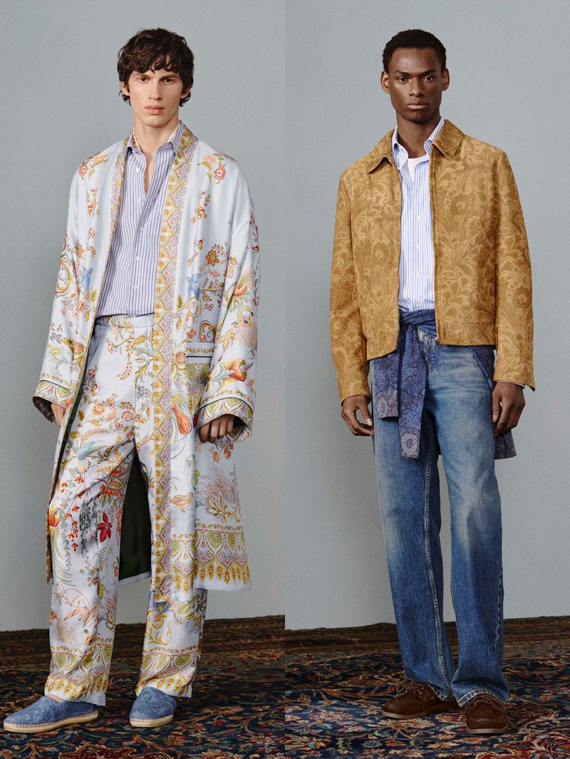 植物与动物图案的元素在某种程度上得到了平衡,通过同色调的叠加方式呈现出一种纯色的视觉效果,同时又保留了装饰性的精神。男装风格则变得更为内敛,不再像女装那样展现出那种飘逸张扬的风格,抽象或植物图案虽然繁复,但都显得有所克制,无论是针织运动衫搭配提花牛仔布,还是在简约的拉链帆布夹克上印制图案,又或是将提花织入双排扣西装外套中以打造简约的定制西装,向埃特罗品牌标志性的装饰性奢华风格致敬。