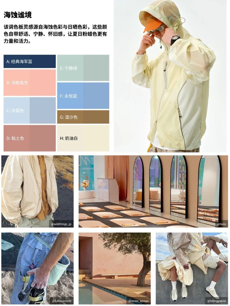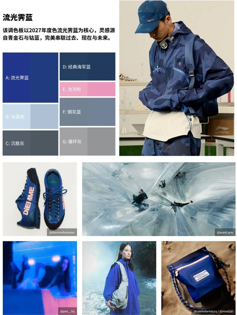 2027年度色流光霁蓝搭配其他蓝色与关键色泡泡粉,用粉色和柔和中性色为户外款式和实用款式构建宁静怀旧的调色板使用浓重深底色和大地系点缀色,营造古典感,让奢华纹理更高档用冷暖色调平衡柔和醒目的落日色彩,为功能款式增添高级精致感将自然与科技相融,打造荧光色点缀的醒目发光色彩灵感源自草坪与林地的大地色系与天然绿色自带返璞归真的质朴魅力使用活力粉蜡色,彰显个性表达,营造千禧怀旧风用活力亮色构建明快调色板,重点强调蓝色和绿色细腻色彩搭配橙色点缀,用于核心产品和性能款式,强调中性色的持久吸引力、稳定性、耐用性以商务着装为灵感,干练配色为经典色彩注入运动感受工业色调与沙漠炽热色彩启发,利用冷暖对比的撞色效果!