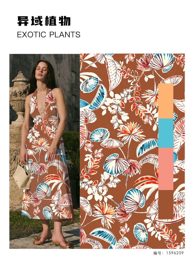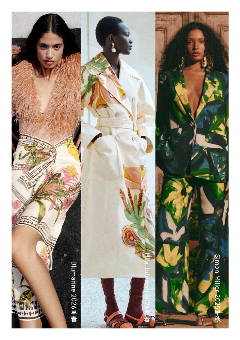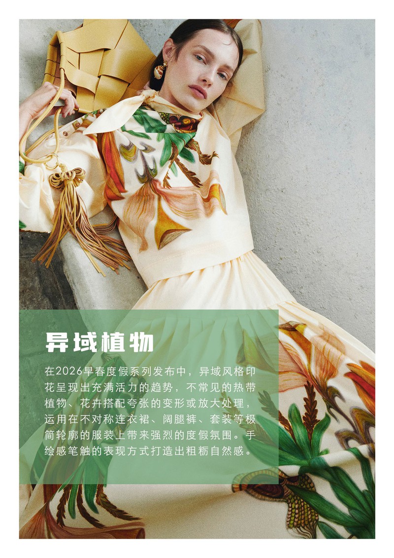 2026早春女装印花&图案趋势:异域植物在2026早春度假系列发布中,异域风格印花呈现出充满活力的趋势,不常见的热带植物、花卉搭配夸张的变形或放大处理,运用在不对称连衣裙、阔腿裤、套装等极简轮廓的服装上带来强烈的度假氛围。手绘感笔触的表现方式打造出粗粝自然感。