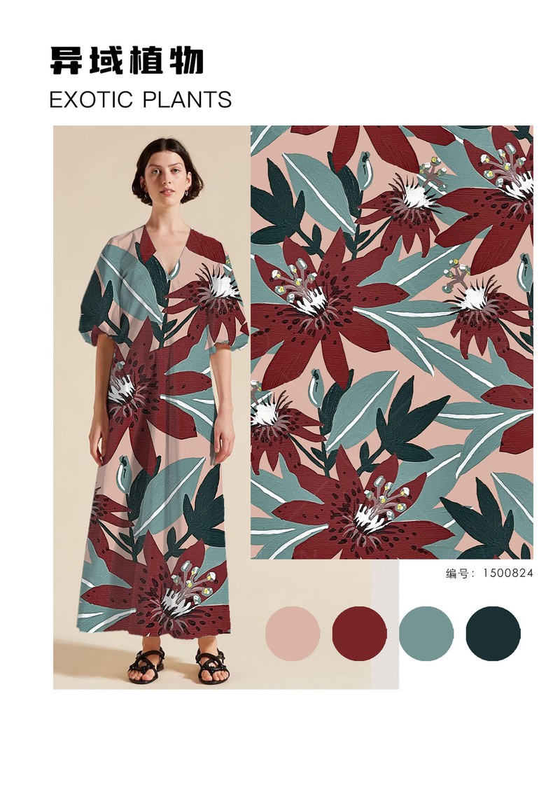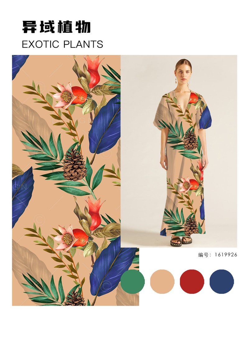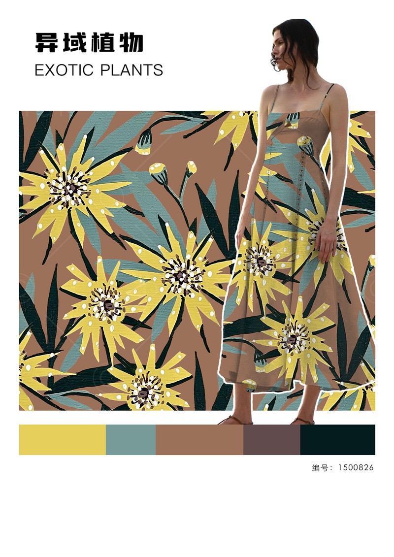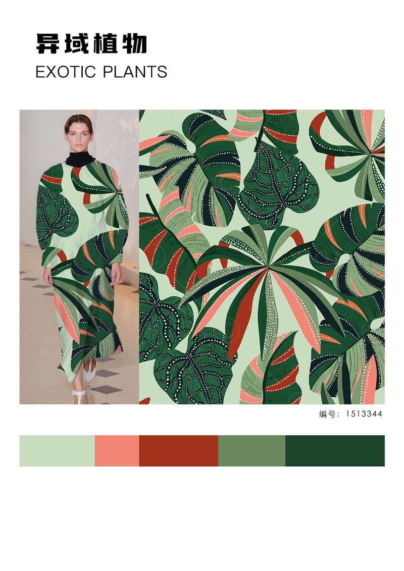 2026早春女装印花&图案趋势:异域植物在2026早春度假系列发布中,异域风格印花呈现出充满活力的趋势,不常见的热带植物、花卉搭配夸张的变形或放大处理,运用在不对称连衣裙、阔腿裤、套装等极简轮廓的服装上带来强烈的度假氛围。手绘感笔触的表现方式打造出粗粝自然感。