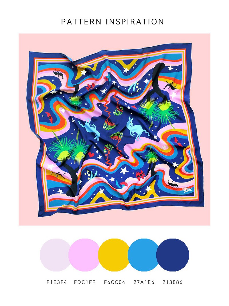 澳大利亚纺织品设计师Julie White的设计风格以其对自然世界的捕捉而独具魅力,她的图案灵感深深植根于澳大利亚本土及更广阔的自然环境,从独特的植物形态、海岸线纹理到微观生物结构,都能在她的作品中找到诗意而抽象的转化。她的色彩运用饱和而富有层次,常以大地色系、宁静的蓝绿色调为基础,点缀以明亮的对比色,传递出温暖且略带复古的气息。White的作品常常带有手绘的痕迹和质感,无论是细腻的笔触、水彩般的晕染还是类似版画的效果,都为其设计注入了独特的温度与手工艺术,广泛应用于丝巾、家居织物和时尚领域。