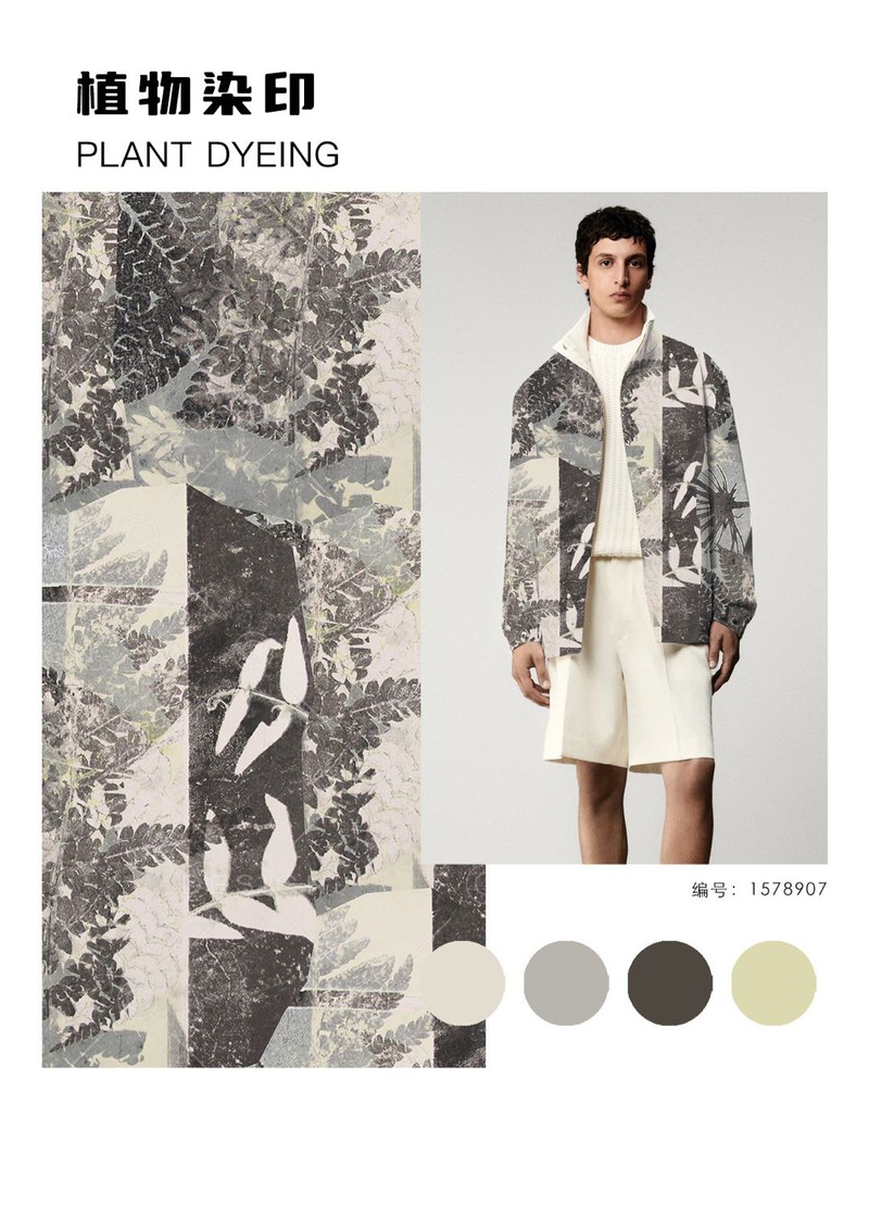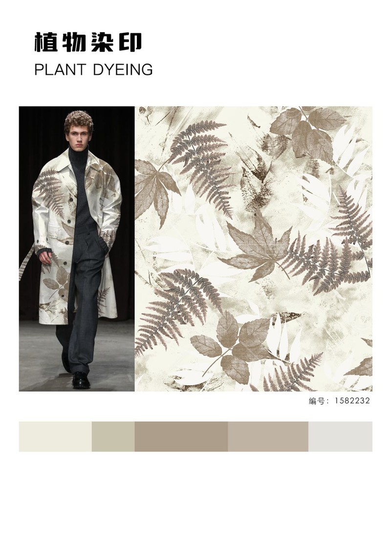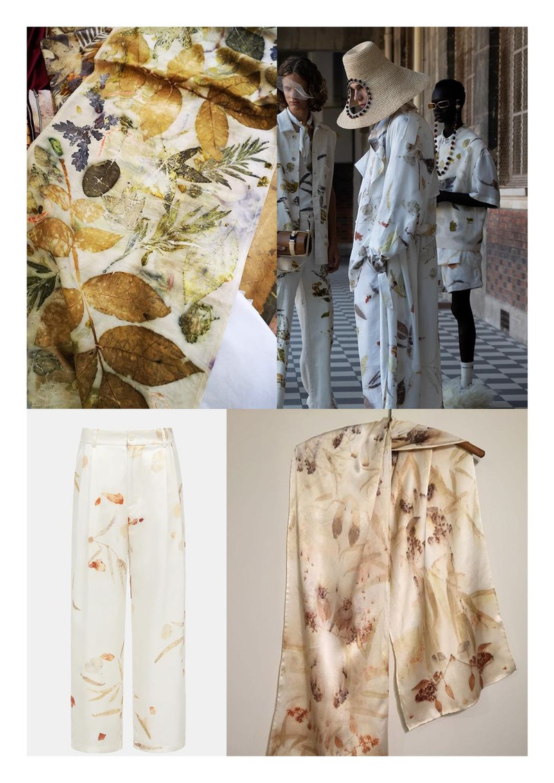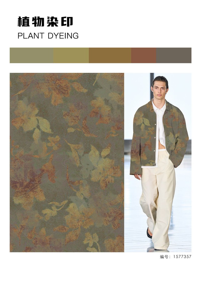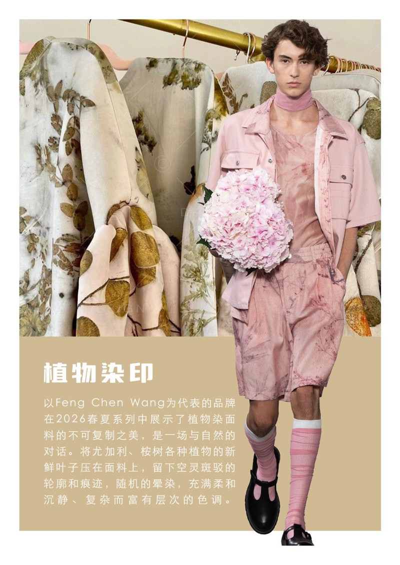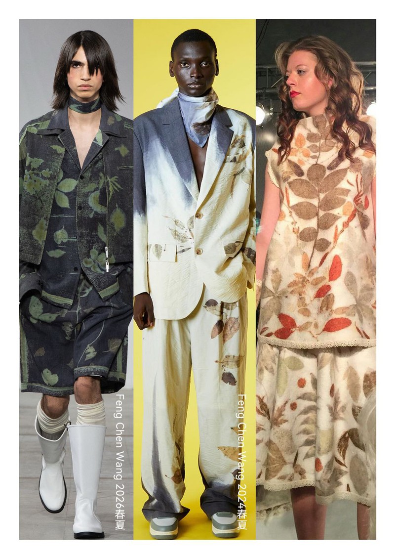 2026春夏华亿平台图案趋势:植物染印以Feng Chen Wang为代表的品牌在2026春夏系列中展示了植物染面料的不可复制之美,是一场与自然的对话。将尤加利、桉树各种植物的新鲜叶子压在面料上,留下空灵斑驳的轮廓和痕迹,随机的晕染,充满柔和沉静、复杂而富有层次的色调。