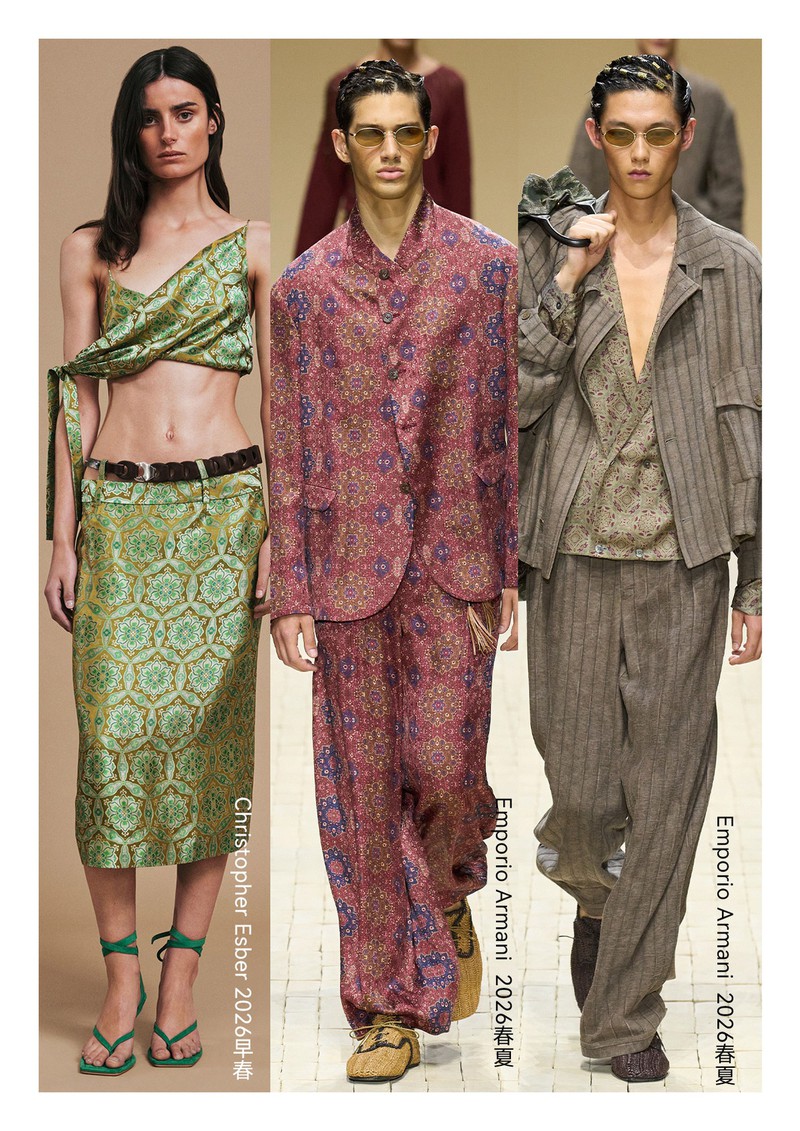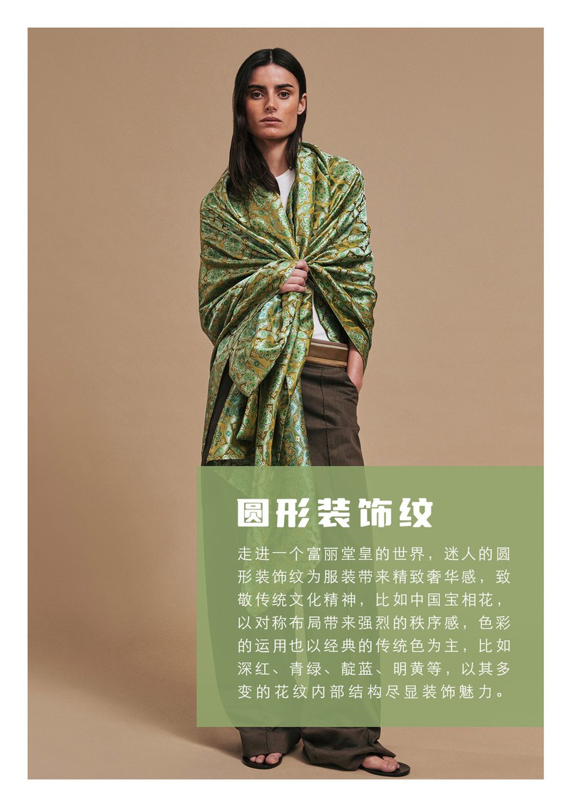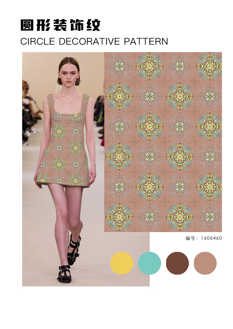 2026春夏印花&图案趋势:圆形装饰纹样走进一个富丽堂皇的世界,迷人的圆形装饰纹为服装带来精致奢华感,致敬传统文化精神,比如中国宝相花,以对称布局带来强烈的秩序感,色彩的运用也以经典的传统色为主,比如深红、青绿、靛蓝、明黄等,以其多变的花纹内部结构尽显装饰魅力。