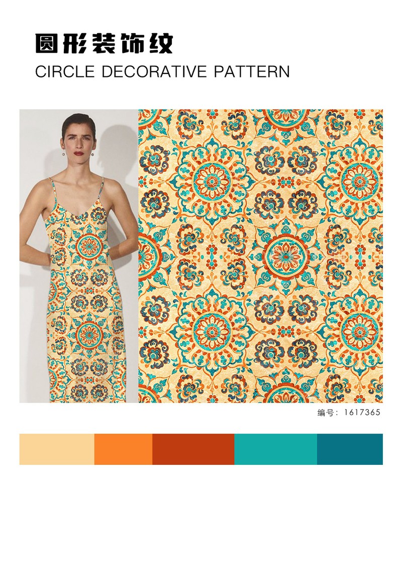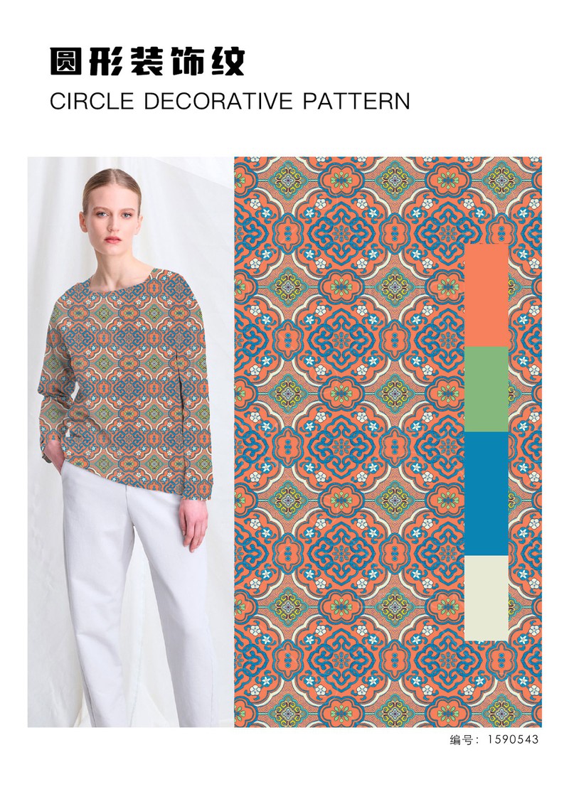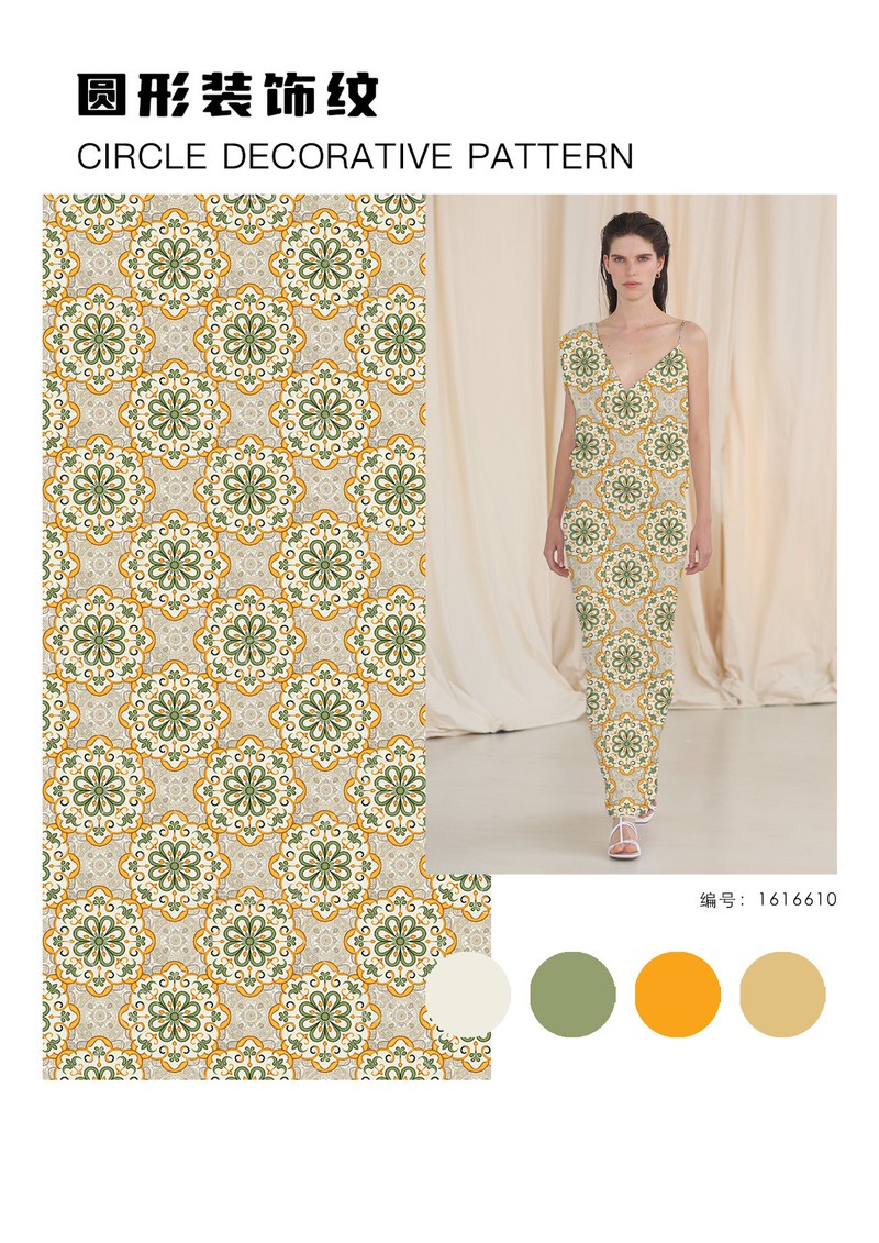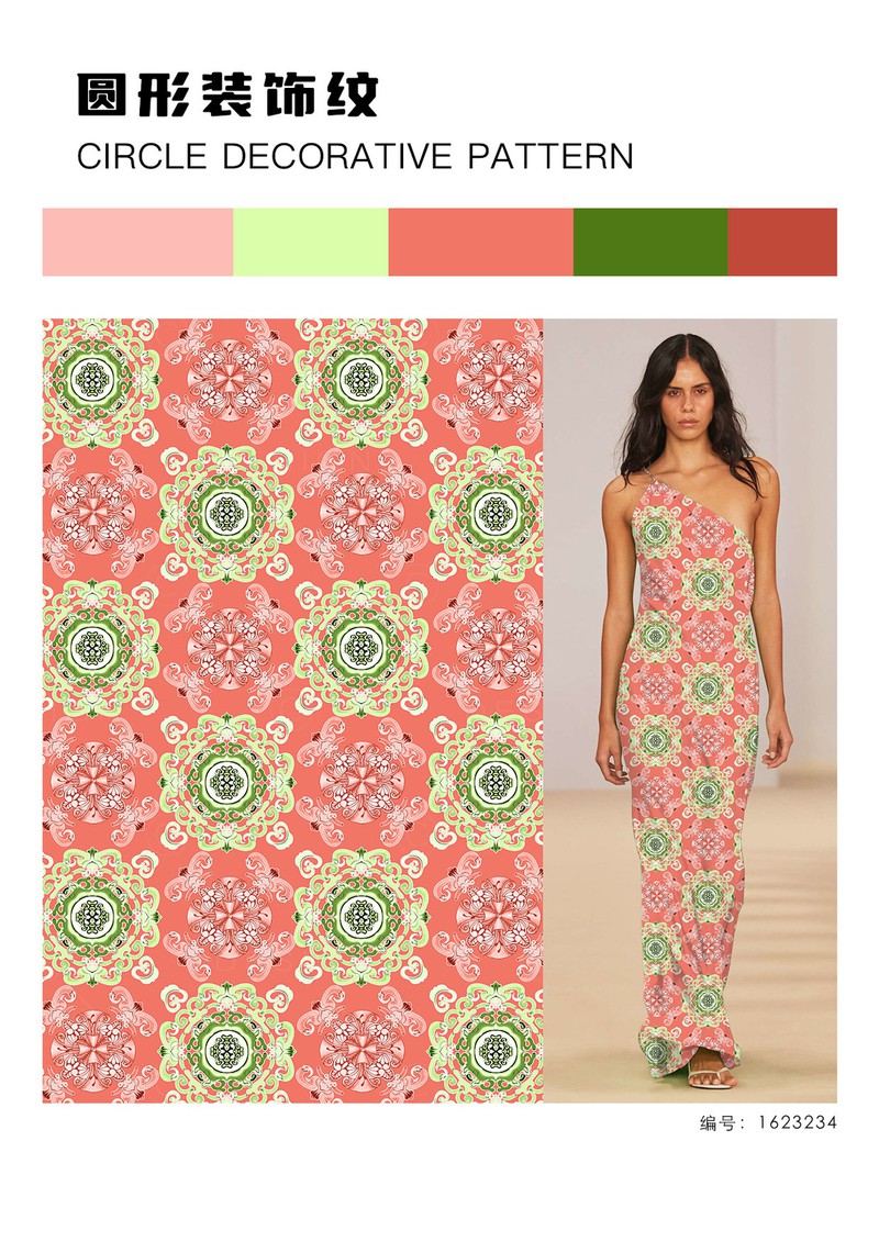 2026春夏印花&图案趋势:圆形装饰纹样走进一个富丽堂皇的世界,迷人的圆形装饰纹为服装带来精致奢华感,致敬传统文化精神,比如中国宝相花,以对称布局带来强烈的秩序感,色彩的运用也以经典的传统色为主,比如深红、青绿、靛蓝、明黄等,以其多变的花纹内部结构尽显装饰魅力。