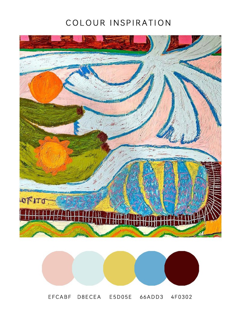图案灵感|艺术家Monika Morito自由温暖的绘画常驻德国的艺术家Monika Morito的绘画受到她的菲律宾血统影响,注入了热带视觉基因,画面常以温暖的色调为主,比如赭石、橙色、阳光黄等等,搭配活力的绿、柔和的浅蓝,融入棕榈树、热带花卉等符号,捕捉自己的艺术风格。她偏爱用油画棒、丙烯等厚重的颜料,用笔触表现粗旷的细节,传达一种自由的态度。她的作品与大海和阳光等自然元素紧密相连,唤起一种温暖的氛围。