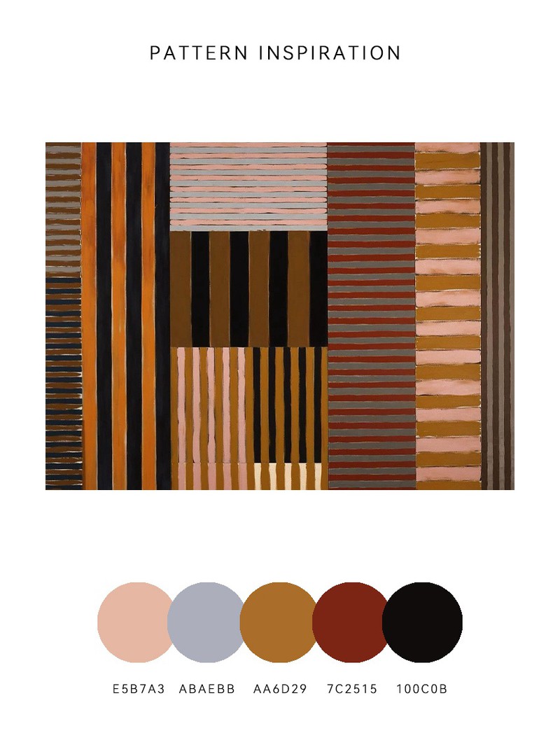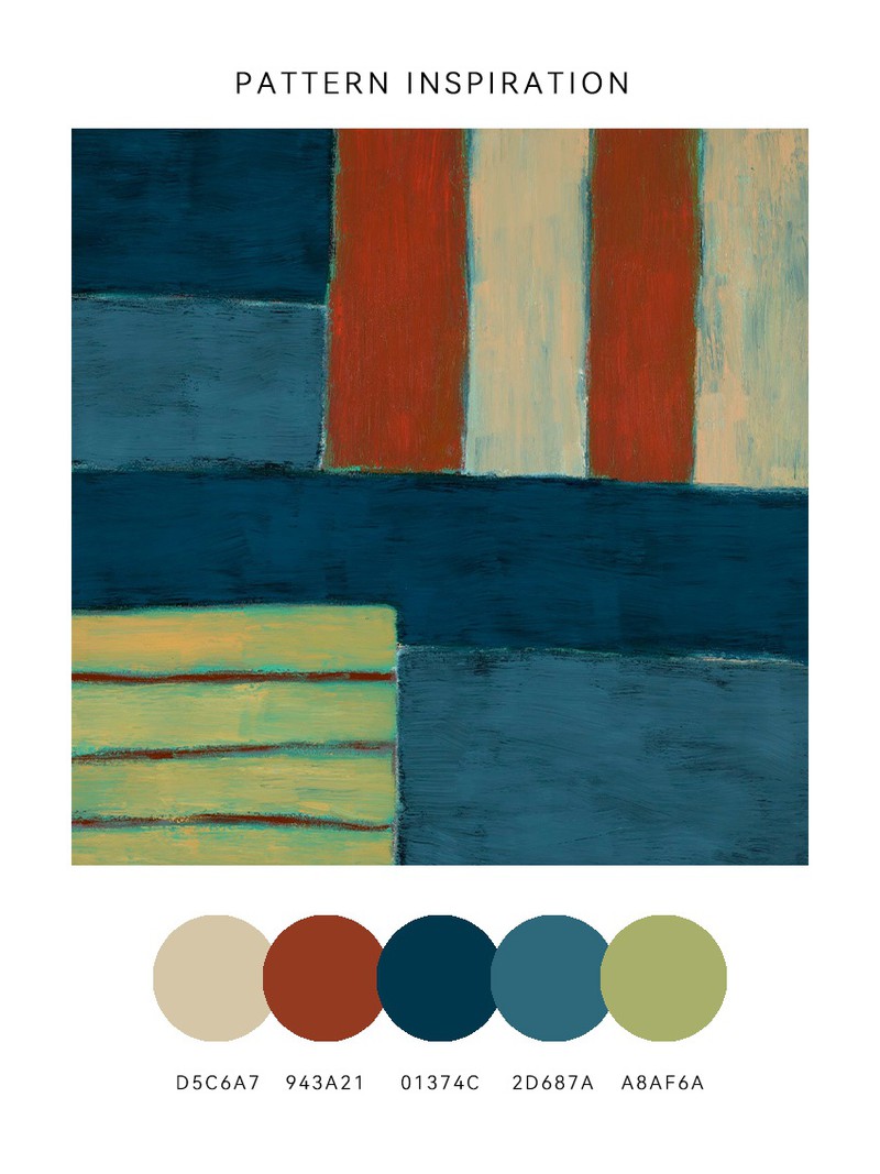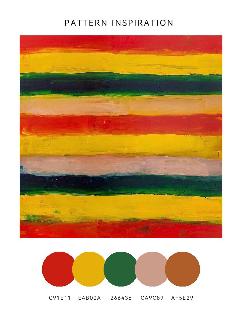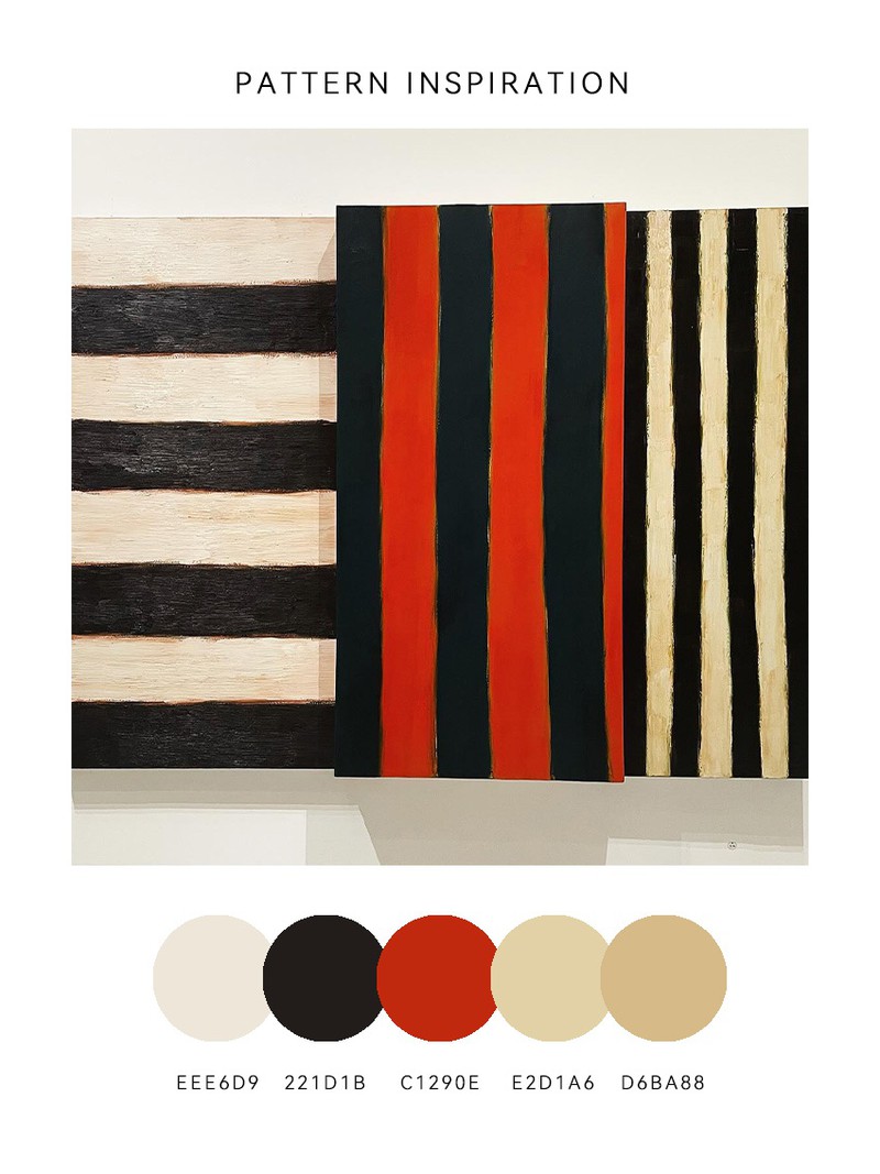 画面笔触明显,颜料堆积厚重,充满强烈的触觉感。色彩是其作品灵魂,深沉、丰富且充满情感张力,常用赭石、蓝灰、深红、黑等,通过色彩间的并置、交融和对比传递情绪与氛围。平时我们在设计几何条纹类的图案时,就可以从这些艺术画作中去寻找灵感,创作出充满艺术气息的抽象图案。