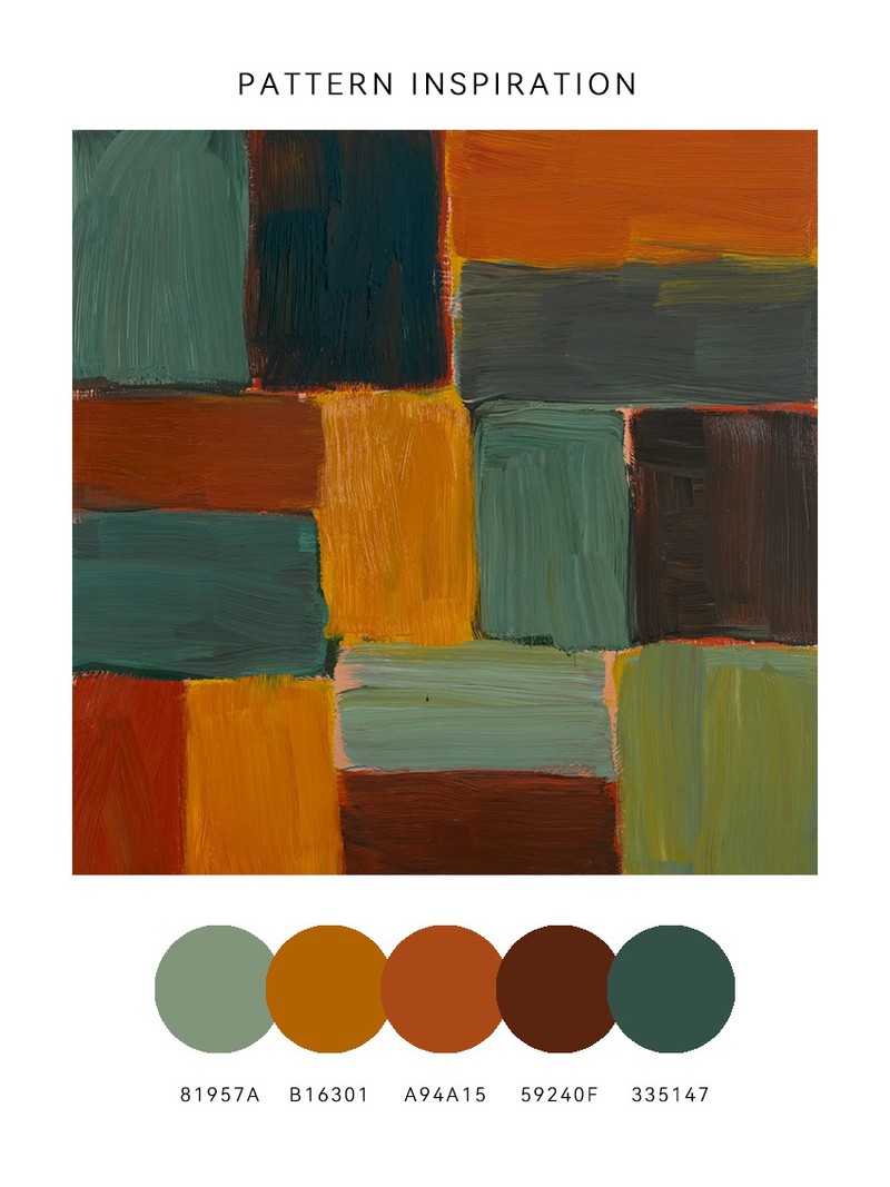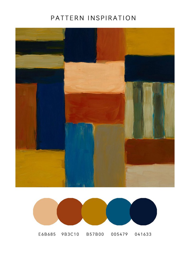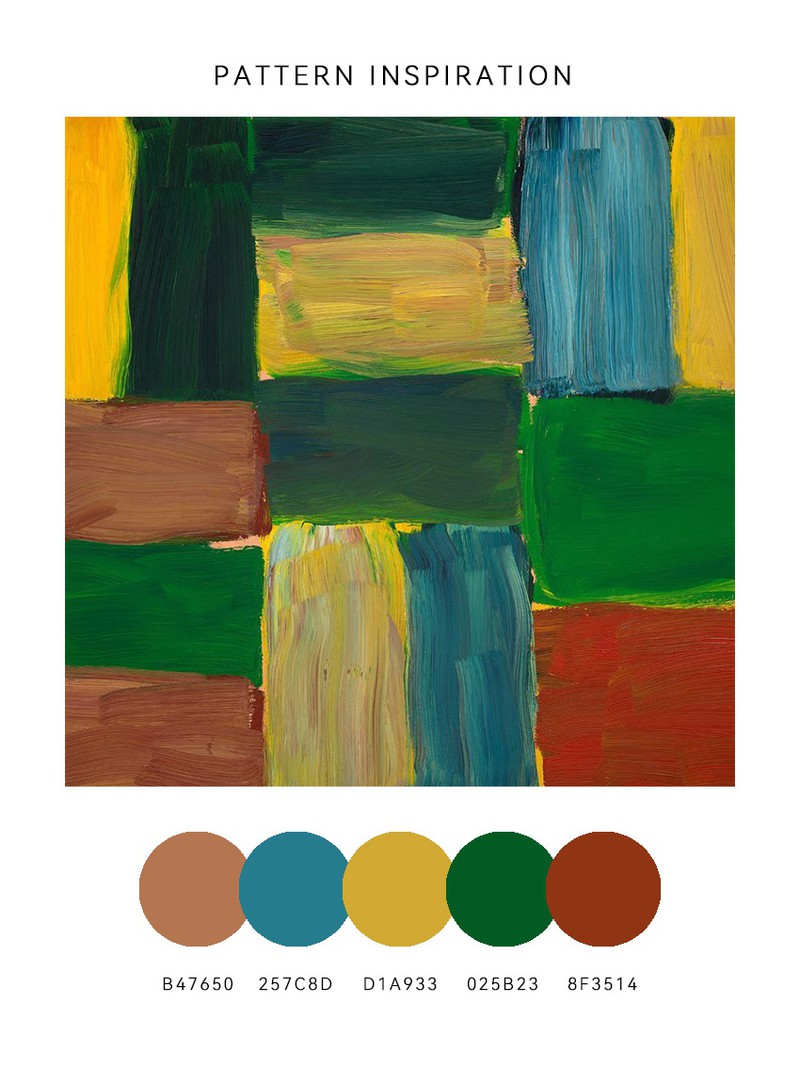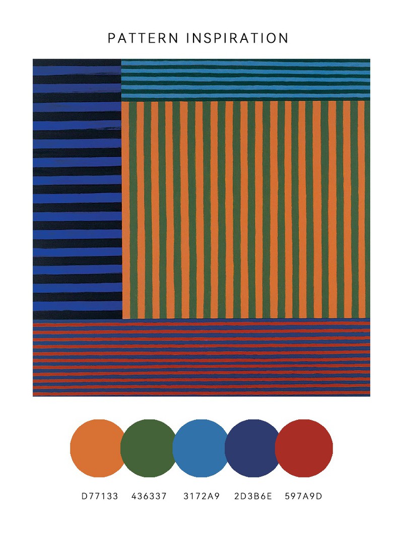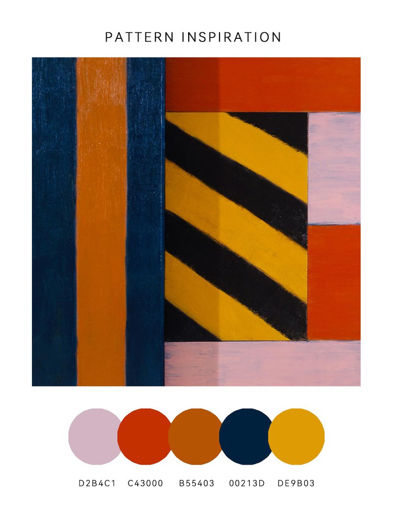 画面笔触明显,颜料堆积厚重,充满强烈的触觉感。色彩是其作品灵魂,深沉、丰富且充满情感张力,常用赭石、蓝灰、深红、黑等,通过色彩间的并置、交融和对比传递情绪与氛围。平时我们在设计几何条纹类的图案时,就可以从这些艺术画作中去寻找灵感,创作出充满艺术气息的抽象图案。
