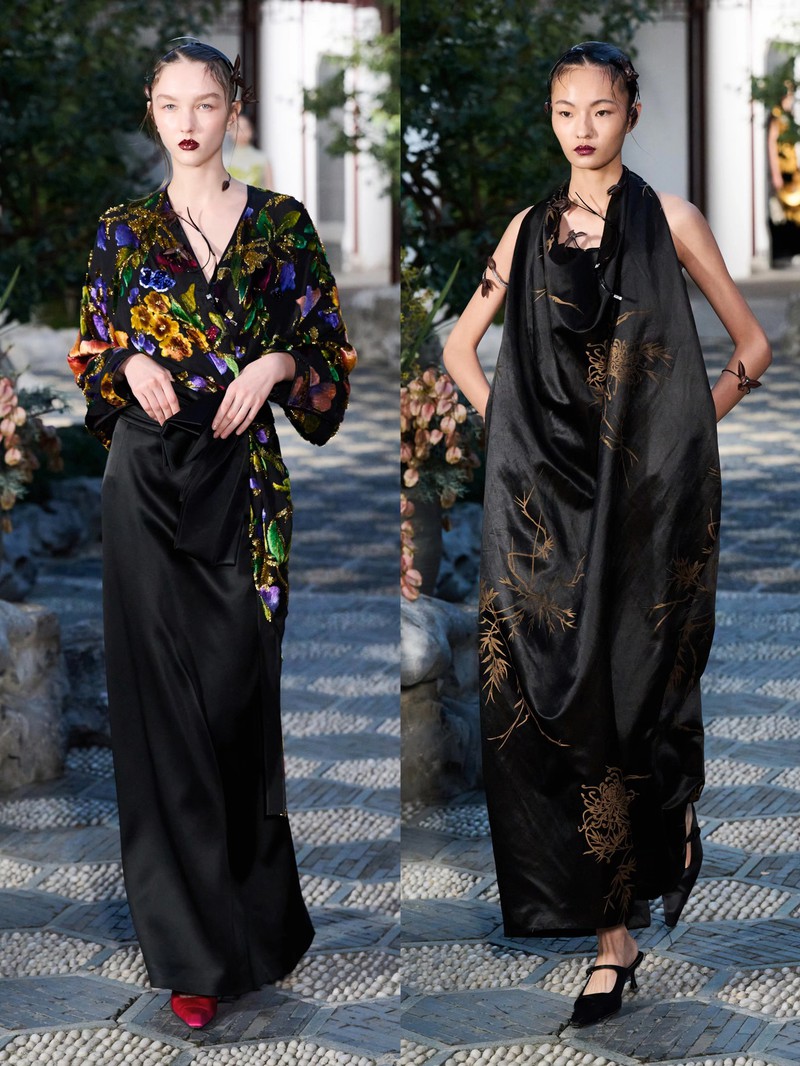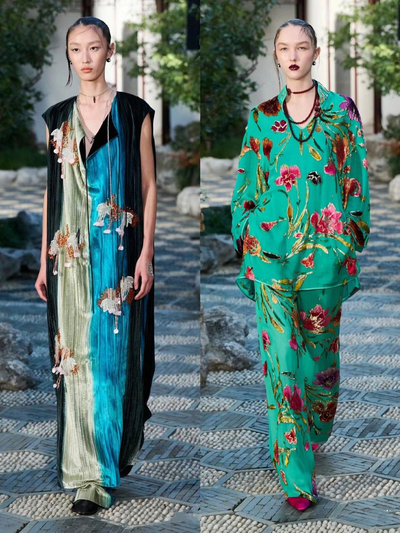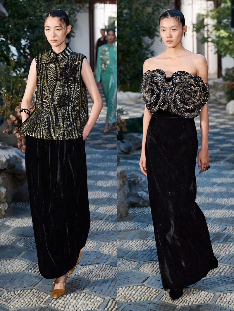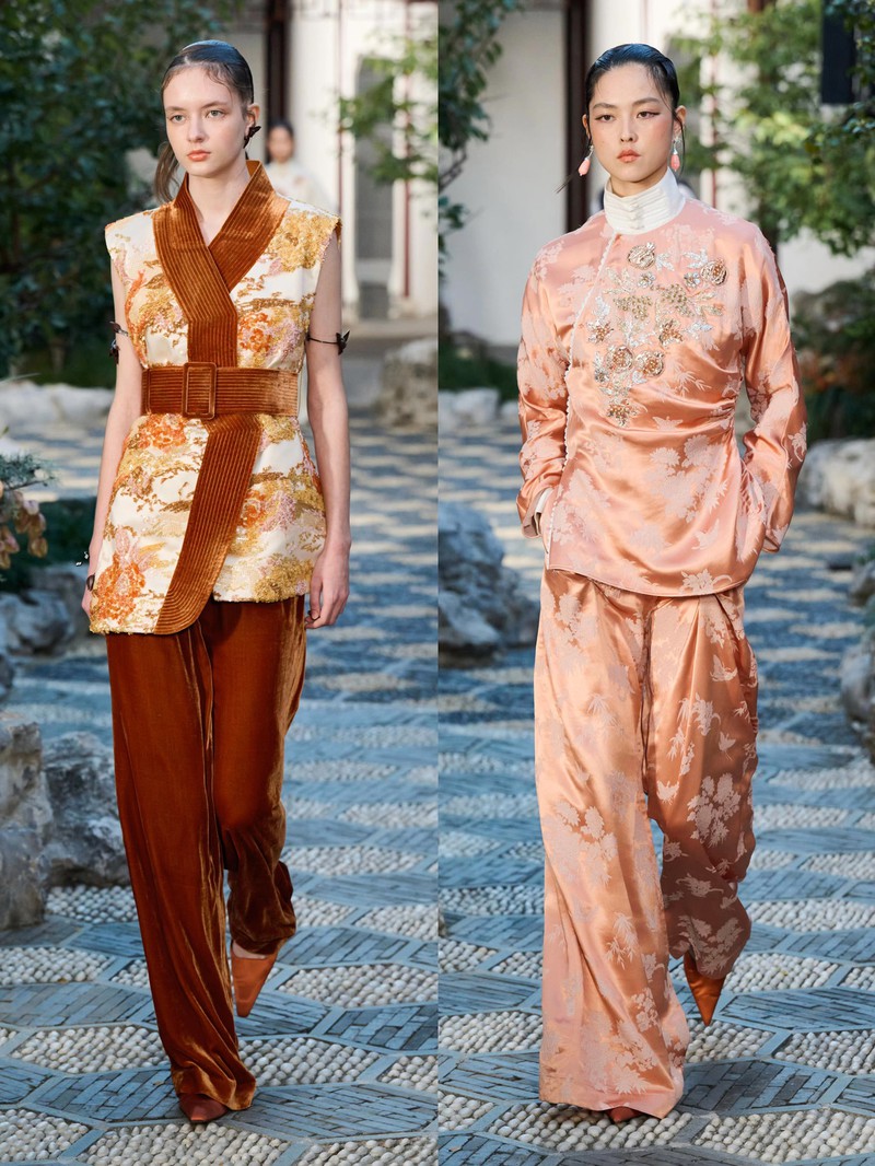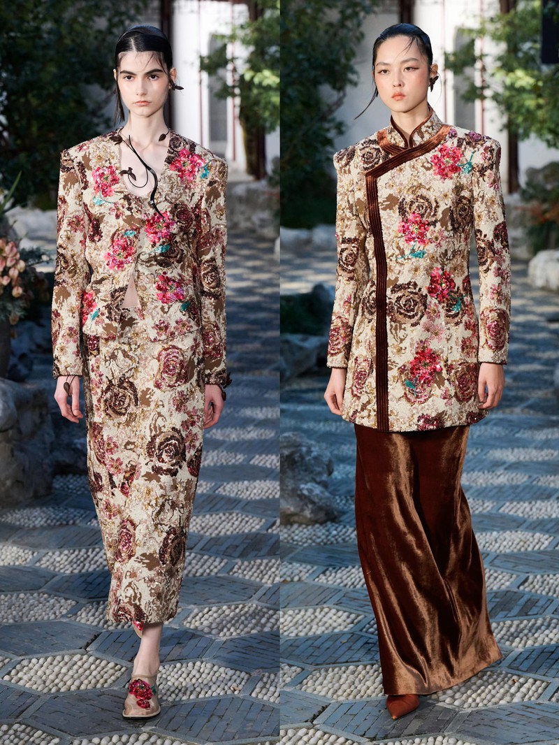 值得一提的是,本季剪裁之精艺,体现在上百片的裁片与缝缀之间,凝聚了令人叹赞的精工细造。绮袄长袍,缎面轻裹身体,中式线条变得更加精炼,融于创意总监马凯的立体剪裁之中,衔接日常与正式,也极尽呈现出游园致远之神韵。