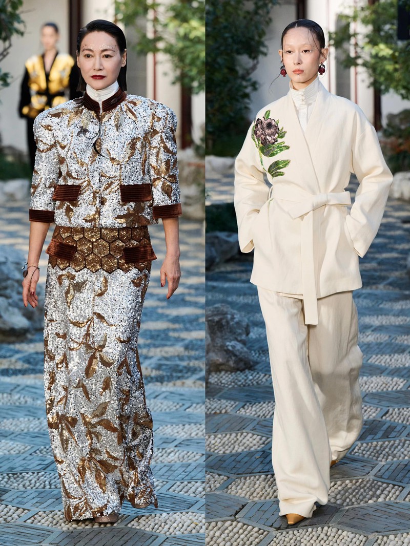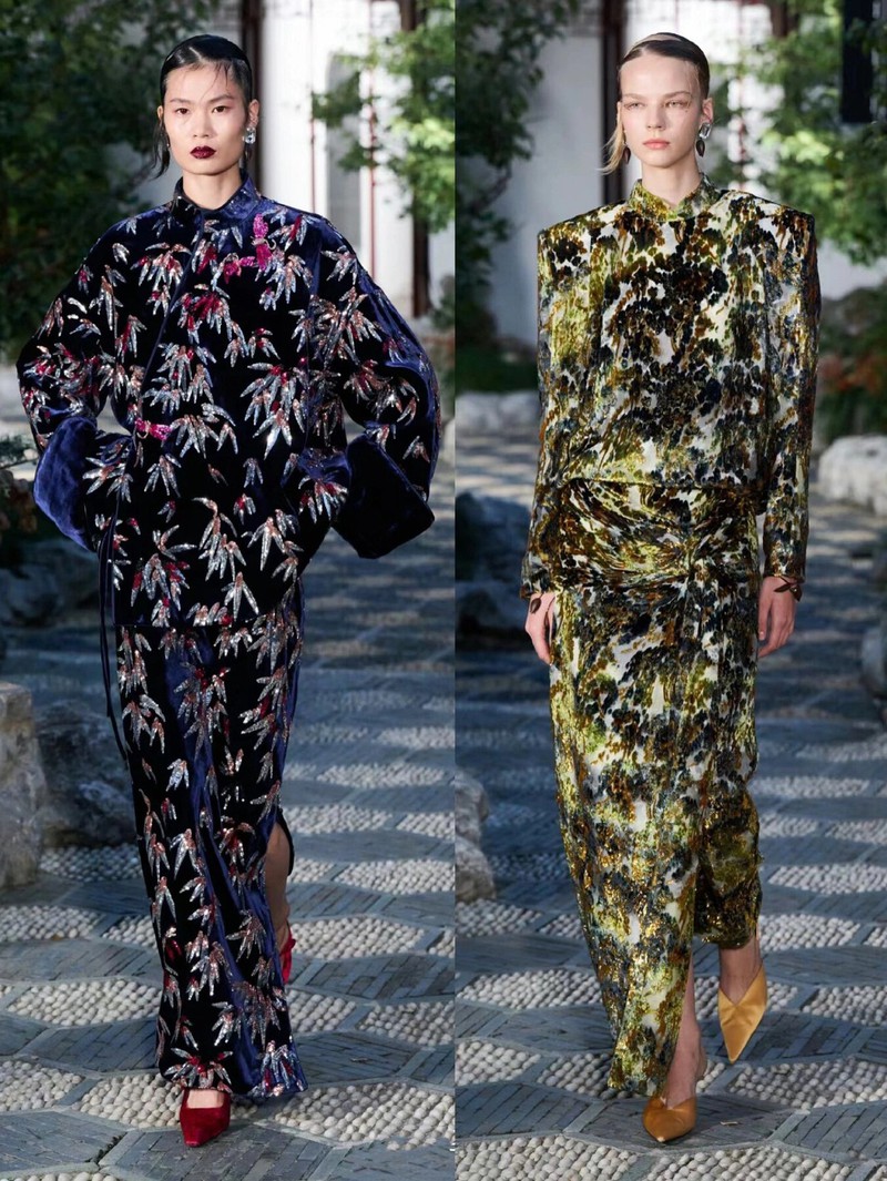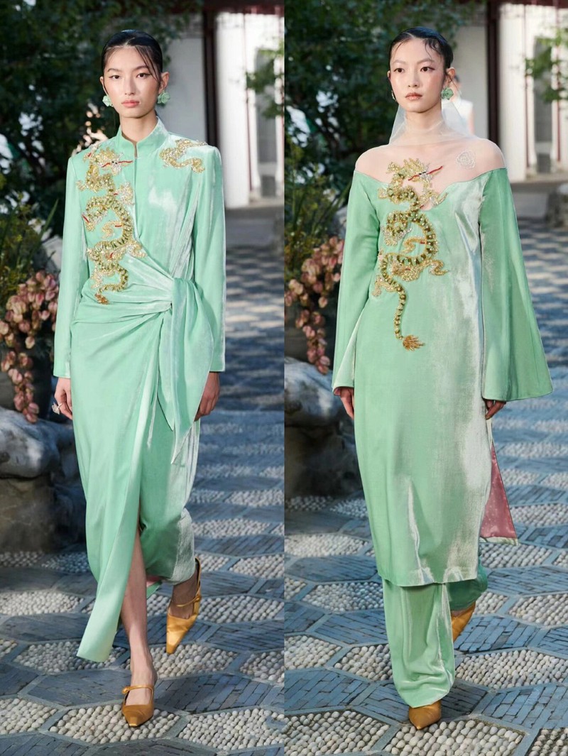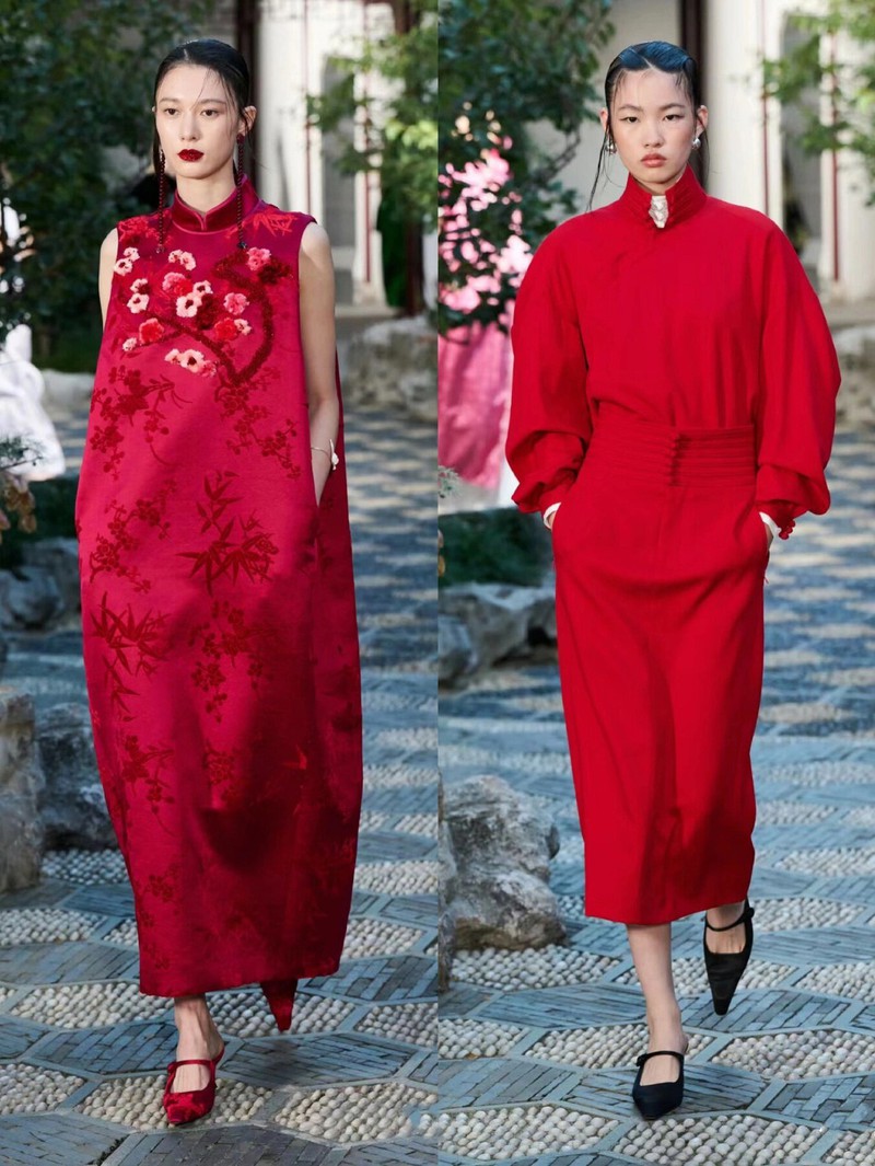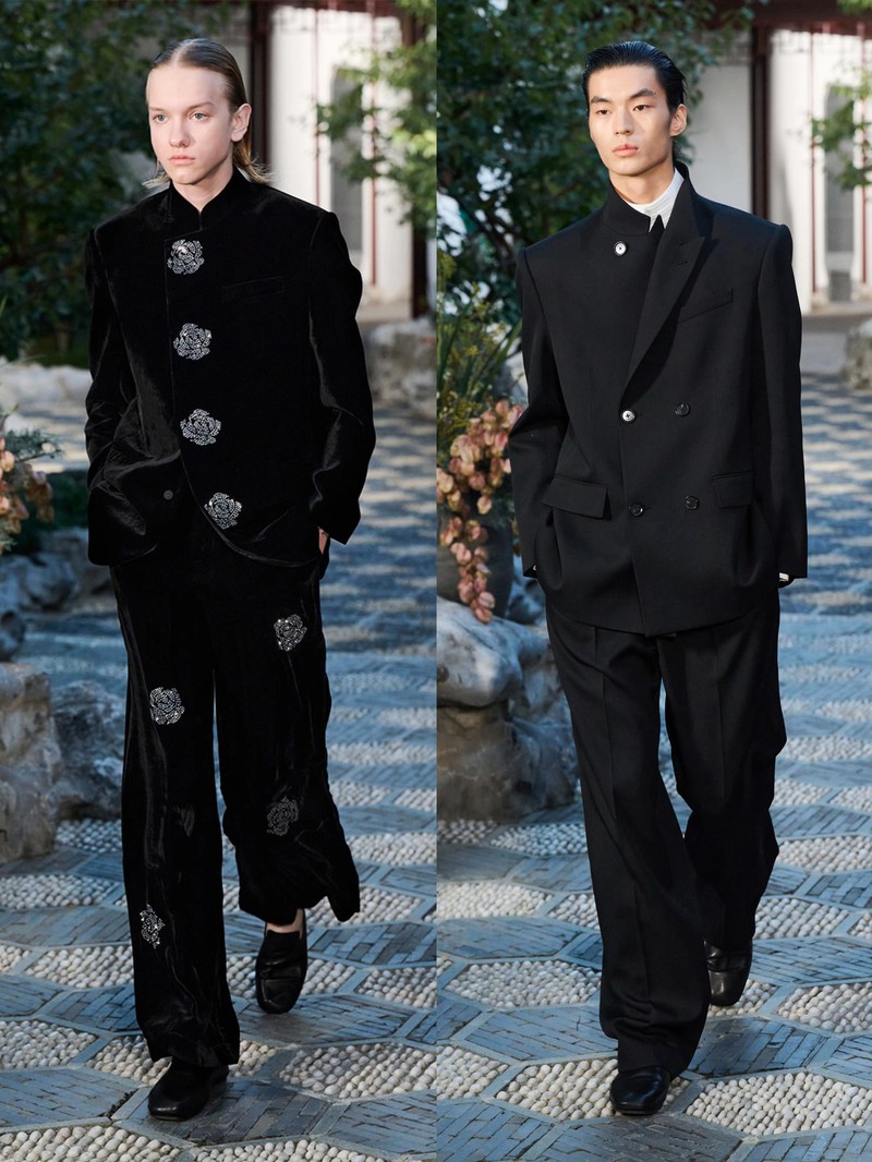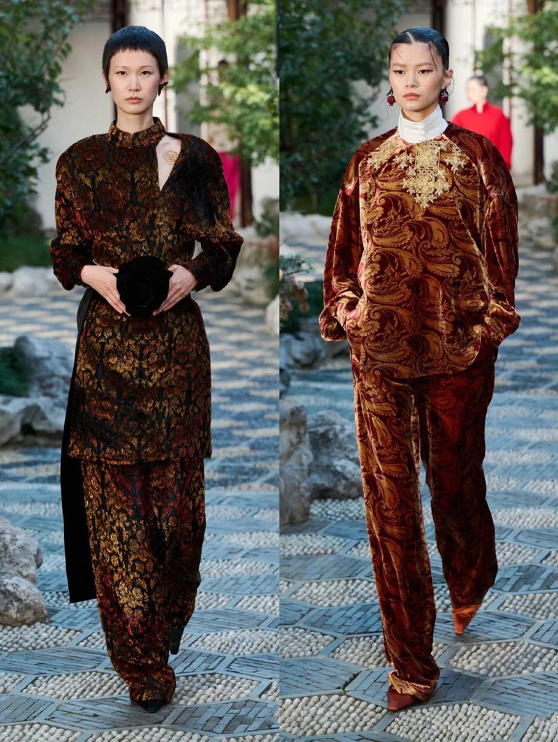 值得一提的是,本季剪裁之精艺,体现在上百片的裁片与缝缀之间,凝聚了令人叹赞的精工细造。绮袄长袍,缎面轻裹身体,中式线条变得更加精炼,融于创意总监马凯的立体剪裁之中,衔接日常与正式,也极尽呈现出游园致远之神韵。