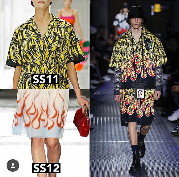 1996年秋冬系列的U型纹、1996年春夏系列的蓝白条纹、2009年春夏系列的海洋生物、2012年春夏系列的火焰、2014年春夏系列的菊花……这些重新复活的图案中,香蕉和火焰图案的男士短袖加垫衬衫引起了很多人的注意,因为它最贵——中国官网售价1.48万元,其他衬衫售价基本都在万元以下。
