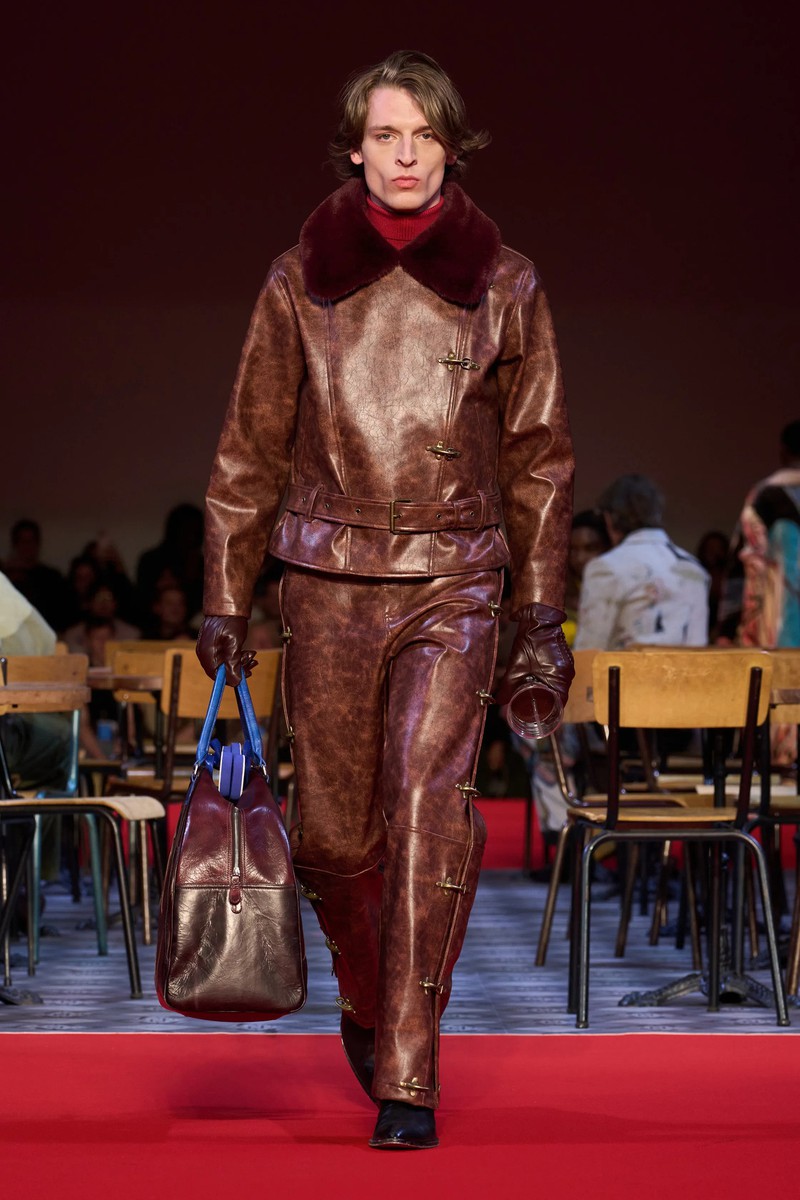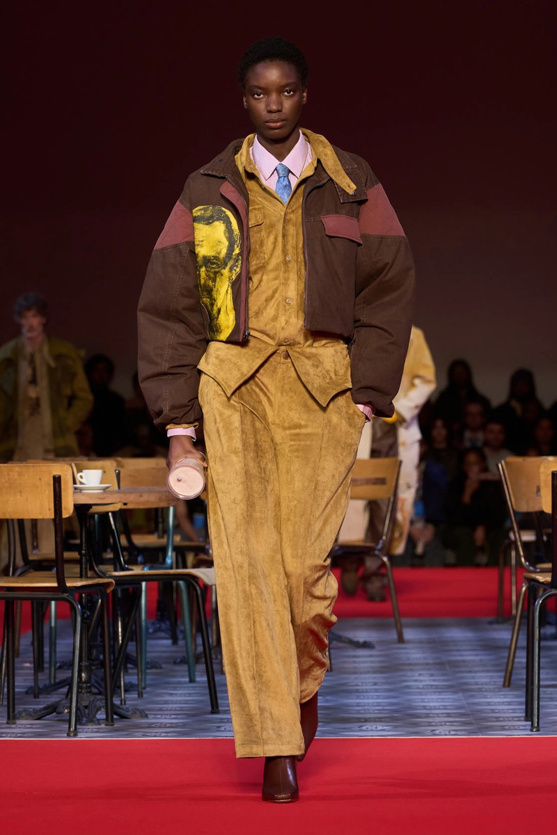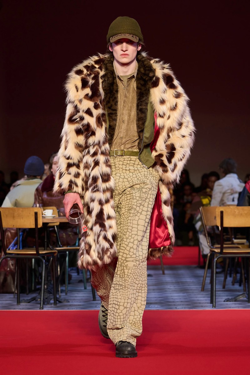 看秀场图案| Kidsuper 2026秋冬手绘涂鸦艺术Kidsuper 2026秋冬男装系列用故障艺术、重复图像与叙事拼贴构建图案语言,标志性手绘涂鸦简化为线条,漫画人物与童年偶像并置,如喷漆质感的肖像印花、循环符号、错位文字,呈现数字时代的破碎美学。色彩以深灰、墨黑、藏青为主,点缀暗红、暗黄,降低饱和度,强化深沉氛围。