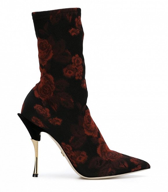 意大利奢侈品牌DOLCE&GABBANA在设计中对印花就格外的偏爱。它曾经推出过一款黑色搭配暗红色玫瑰的高跟尖头靴,摒弃了印象中印花靴子的大红大紫,反而彰显了一种高贵的气质。