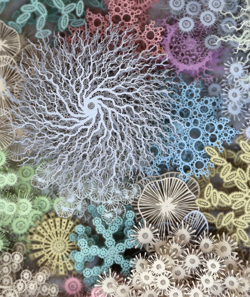 艺术家罗根·布朗利用珊瑚礁的视觉隐喻,从生活在我们体内的微生物中汲取灵感。详细介绍了各种细菌,古细菌和真菌,他制作了复杂的纸质雕塑,希望将这两个世界联系起来。